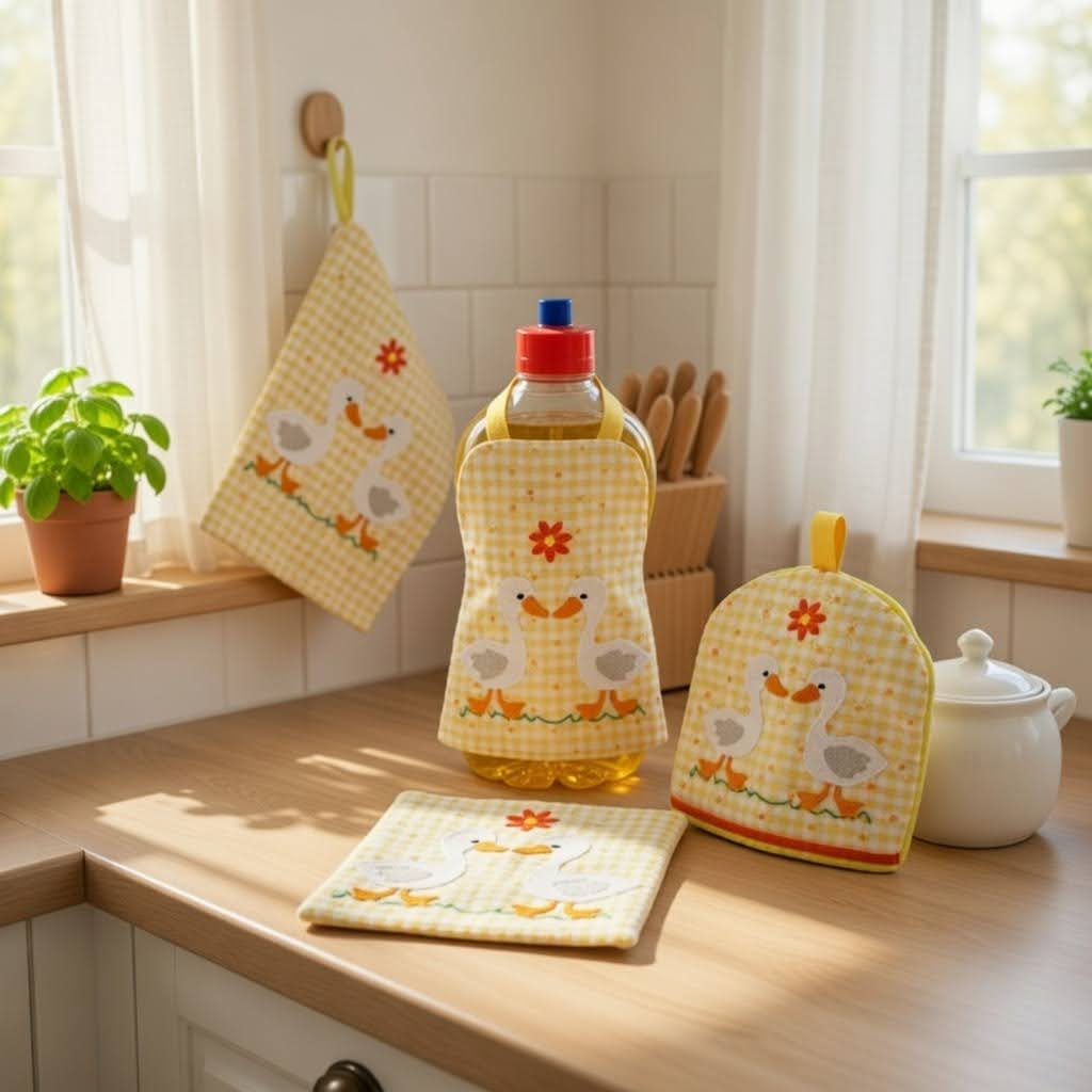 Stickdatei Küche 1 In the Hoop MugRug Gans Set 354 Topflappen Mug Rug Eierwärmer Spülschürze