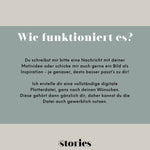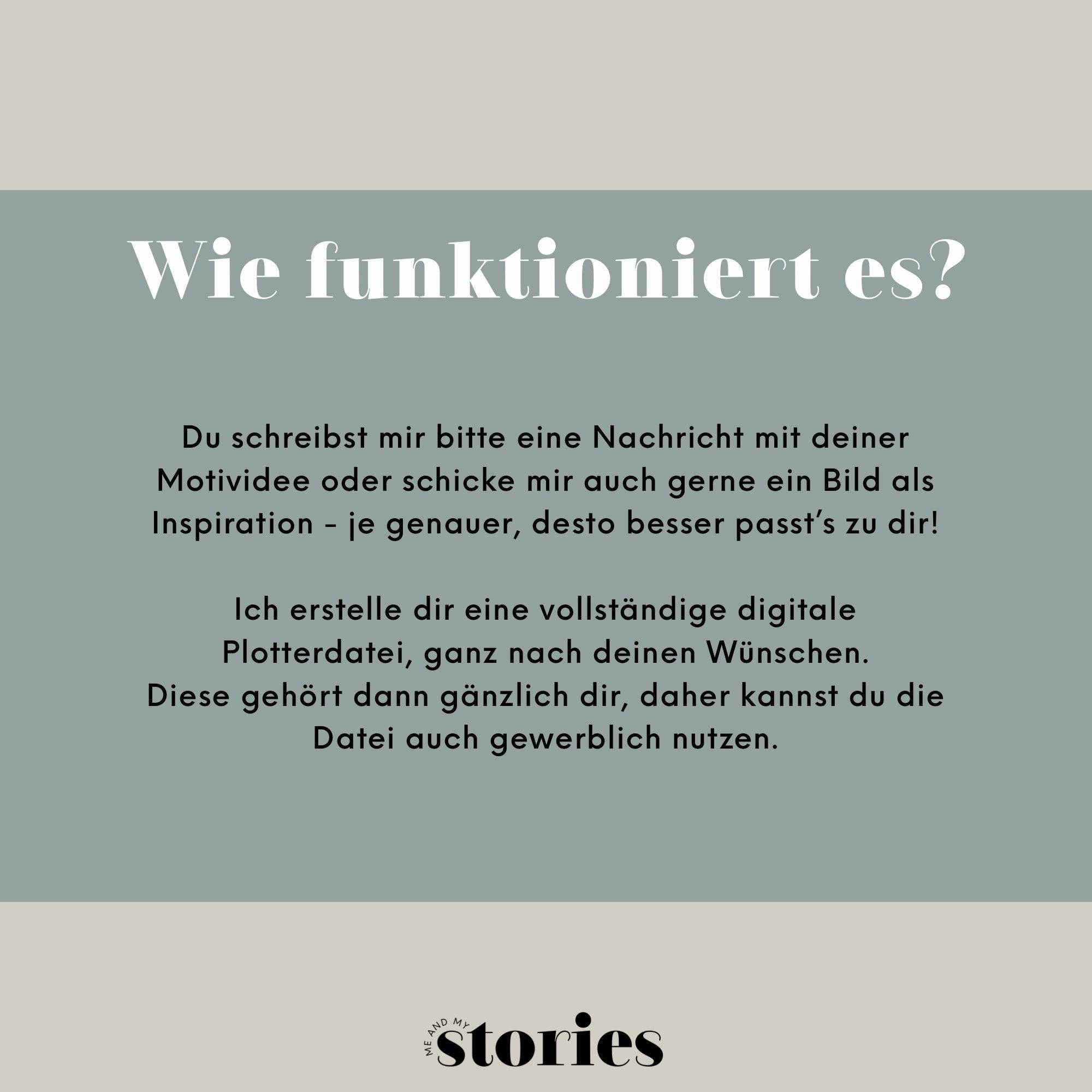 Bitte beschreibe mir möglichst genau, was du dir wünschst – z. B. Motividee, gewünschter Text, Stilrichtung oder ein Bild als Inspiration. Je klarer dein Wunsch, desto passender die Umsetzung. Dazu schreibe mir bitte BEVOR du einen Kauf tätigst, eine Nachricht per Mail an office@andstories.at und wir gestalten deine Plotterdatei gemeinsam - ganz individuell!