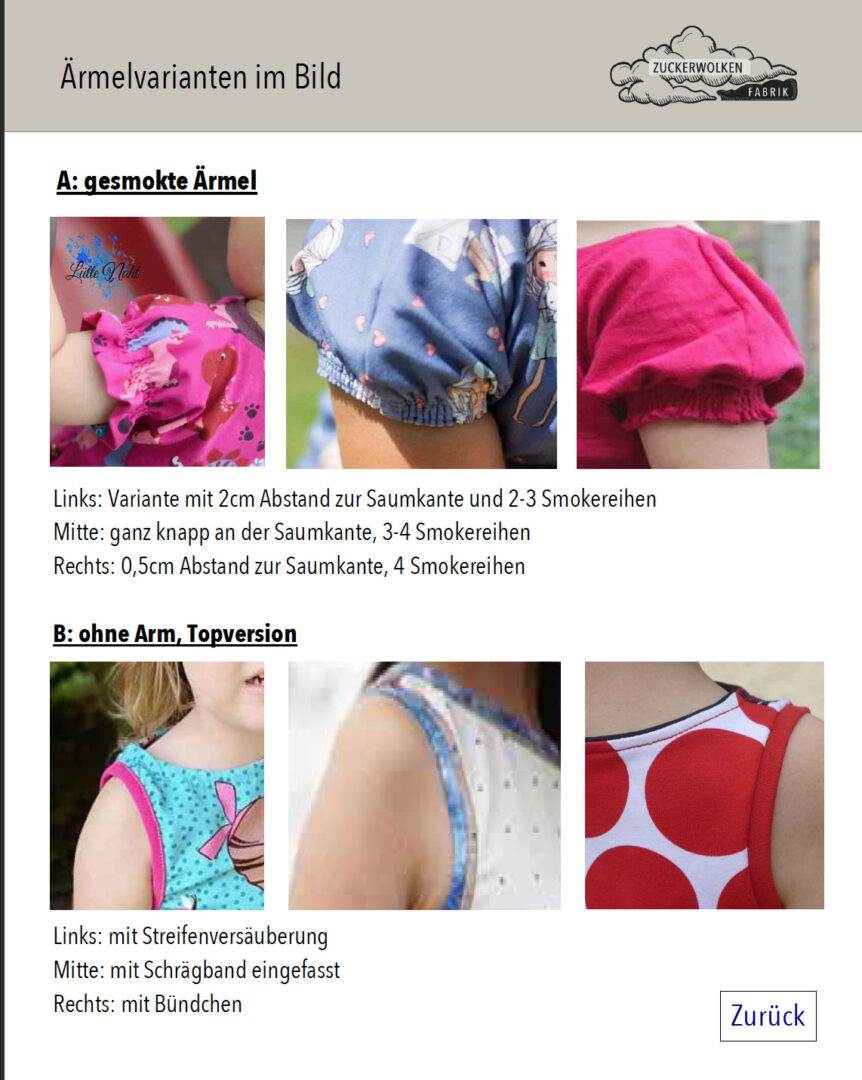 - 11 Ärmelvarianten (Glockenärmel, gesmokte Ärmel, Puffärmel, Flatterärmel, sportlicher Kurzarm, gekrempelter Kurzarm, Kurzarm mit Bündchen, Trägertop, 3 weitere Ärmel laut Tutorial)