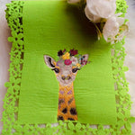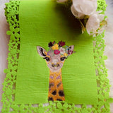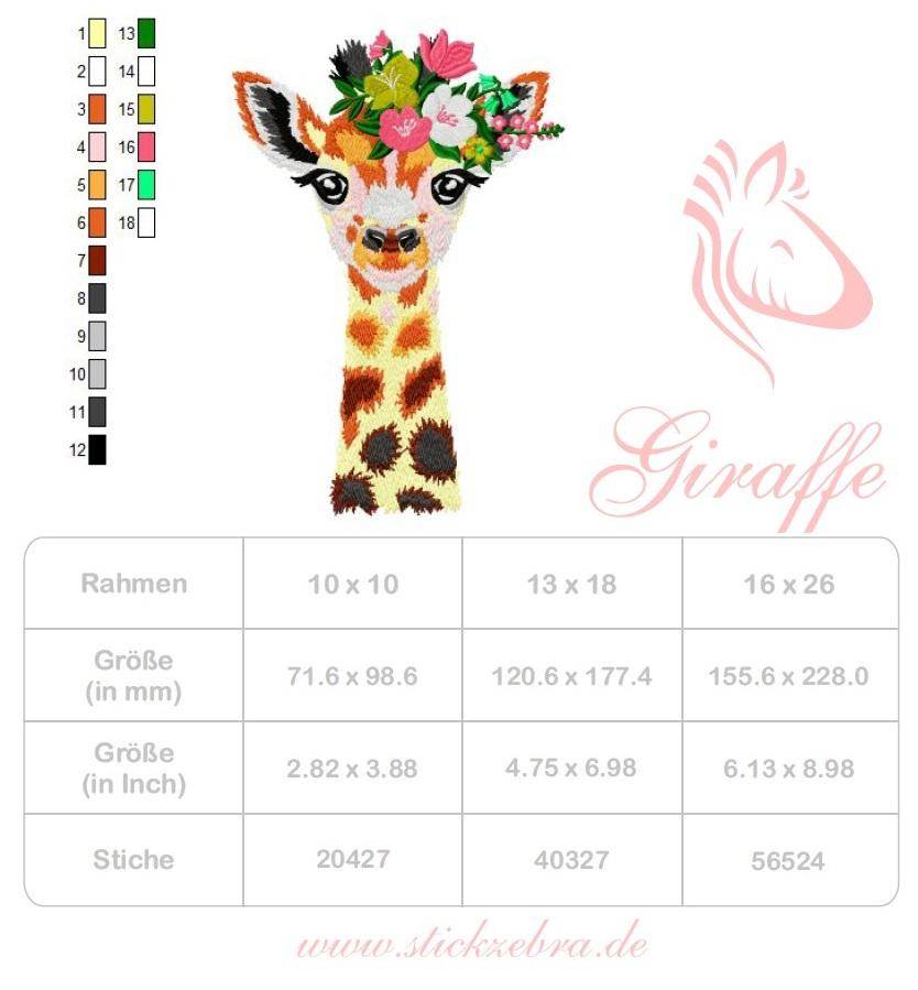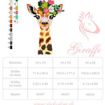 Mit großen, sanften Augen und einem verspielten Blumenkranz auf dem Kopf schaut dich diese zierliche Giraffe freundlich an.