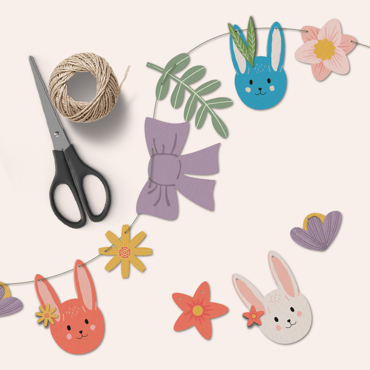 Bringe Farbe in deine Osterfeier mit dieser druckbaren Oster-Girlande! Die Girlande enthält liebevoll gestaltete Motive wie niedliche Osterhasen, Blätter, Blumen und Schleifen – perfekt für Frühlingsfeste, den Osterbrunch oder als festliche Wohnungsdekoration.