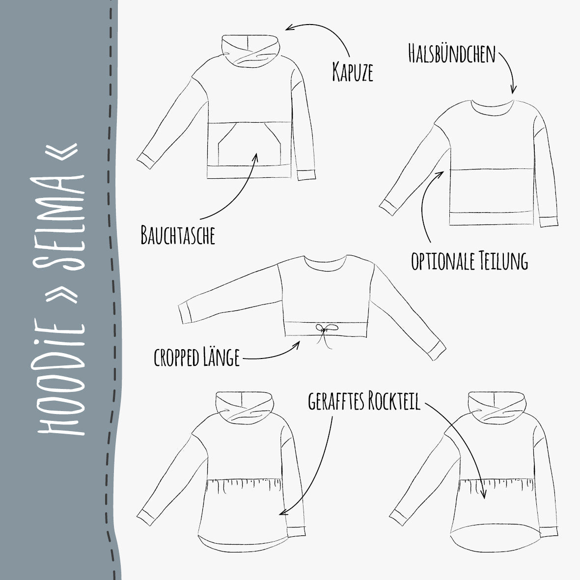 SELMA ist ein lässiger Hoodie mit verschiedenen Optionen. Ob klassisch mit Bauchtasche, mädchenhaft mit gerafftem Rockteil oder als bauchfreier Crop-Pulli - SELMA ist immer wieder anders.