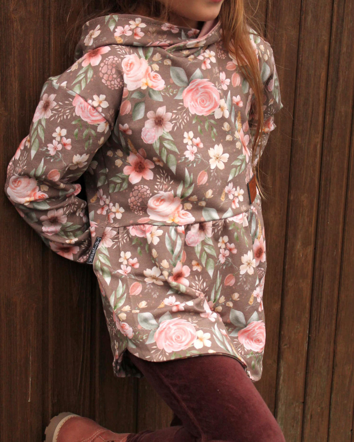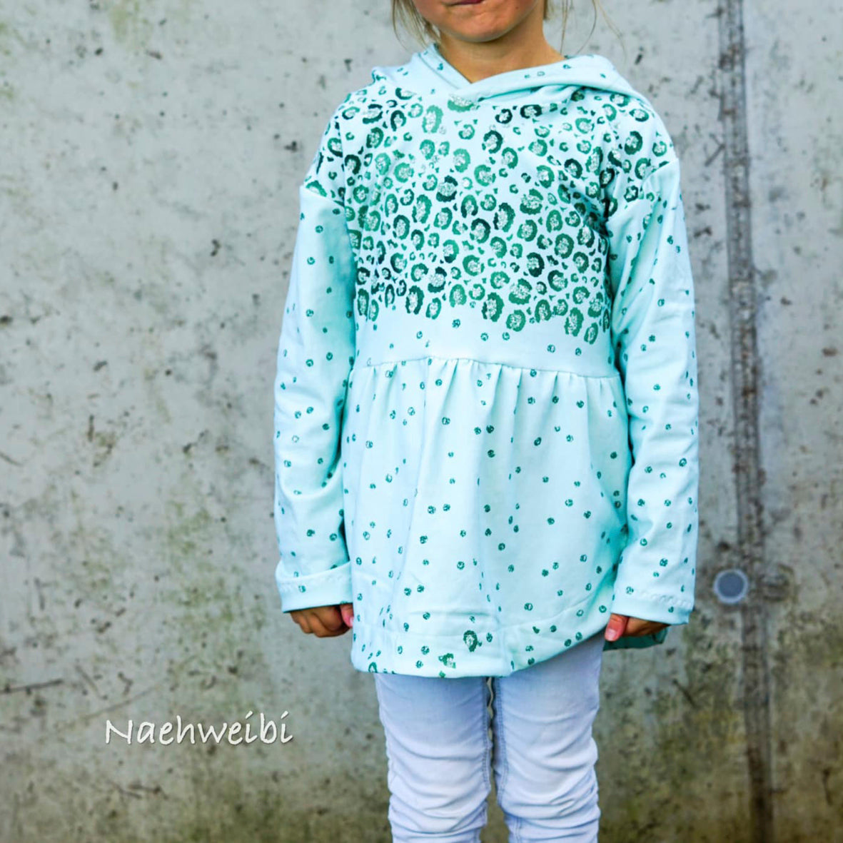 Du kannst ihn als Hoodie mit Kapuze nähen oder als Sweater mit Halsbündchen, mit oder ohne Bauchtasche und auch die verspielte Variante mit gerafftem Rockteil hat 2 verschiedene Varianten.