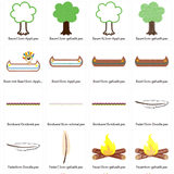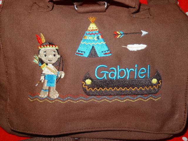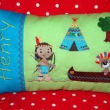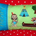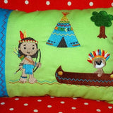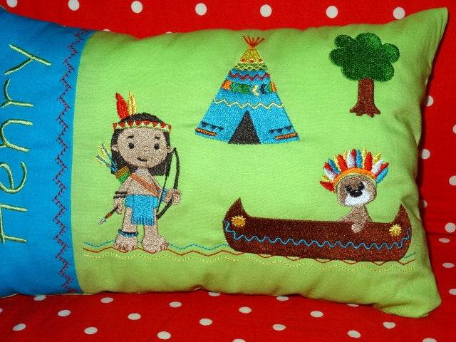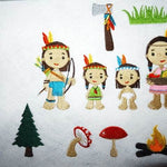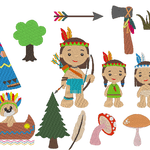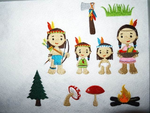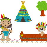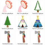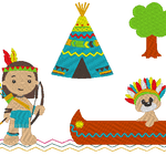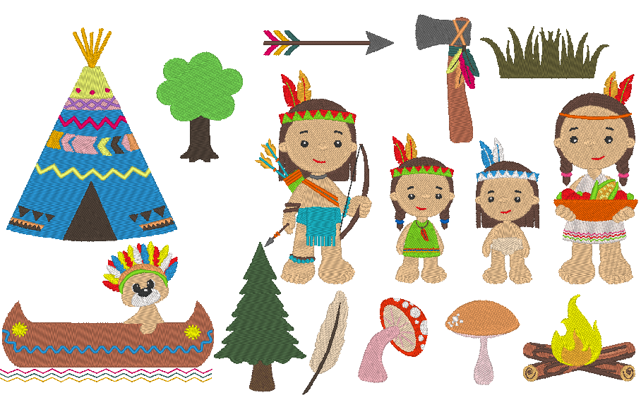 mit Pilzen, Tipi, Feder, Tomahawk, Boot, Pfeil, Baum, Wiese, Feuer und Bordüre