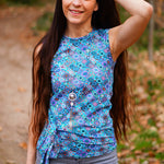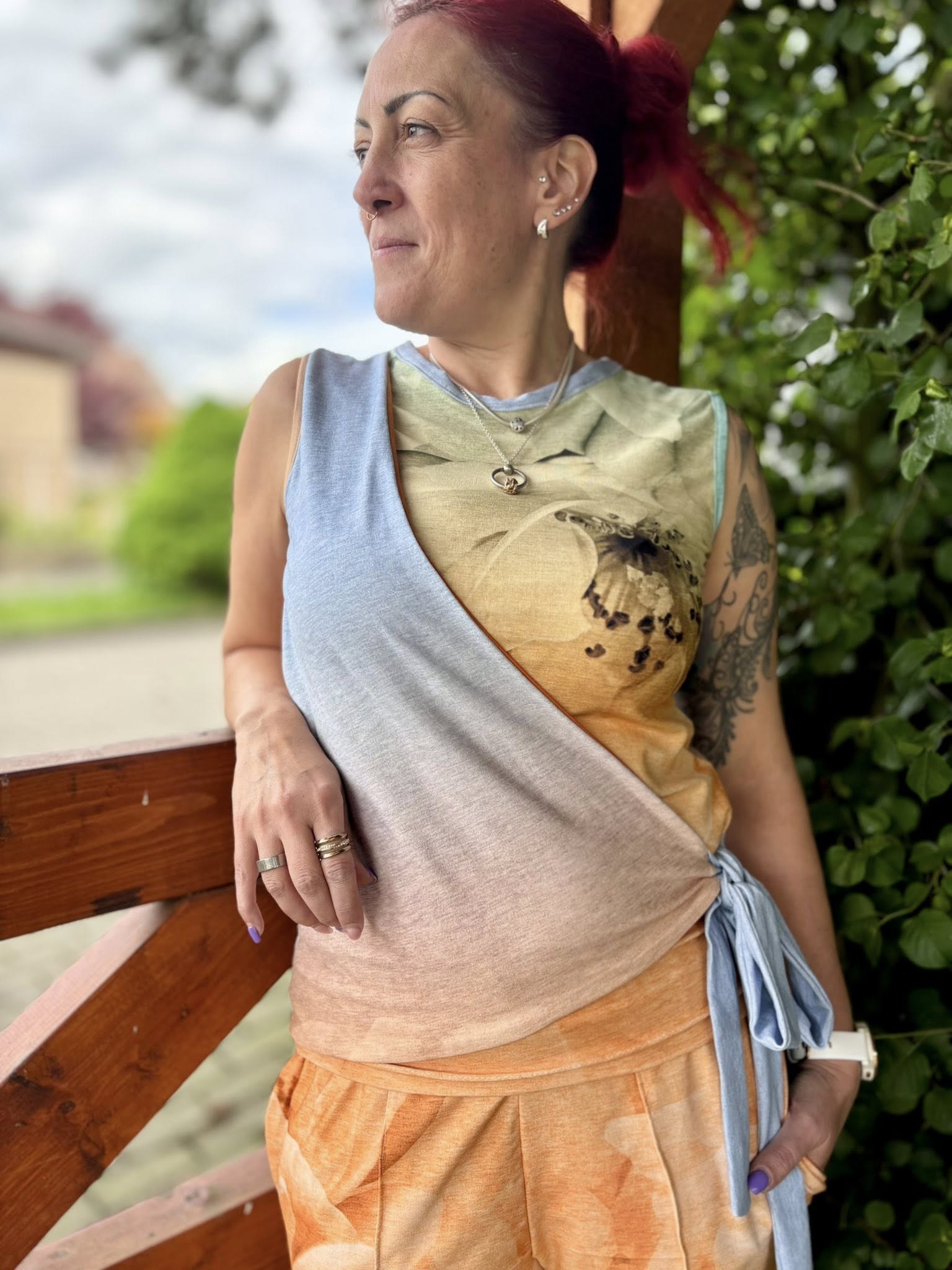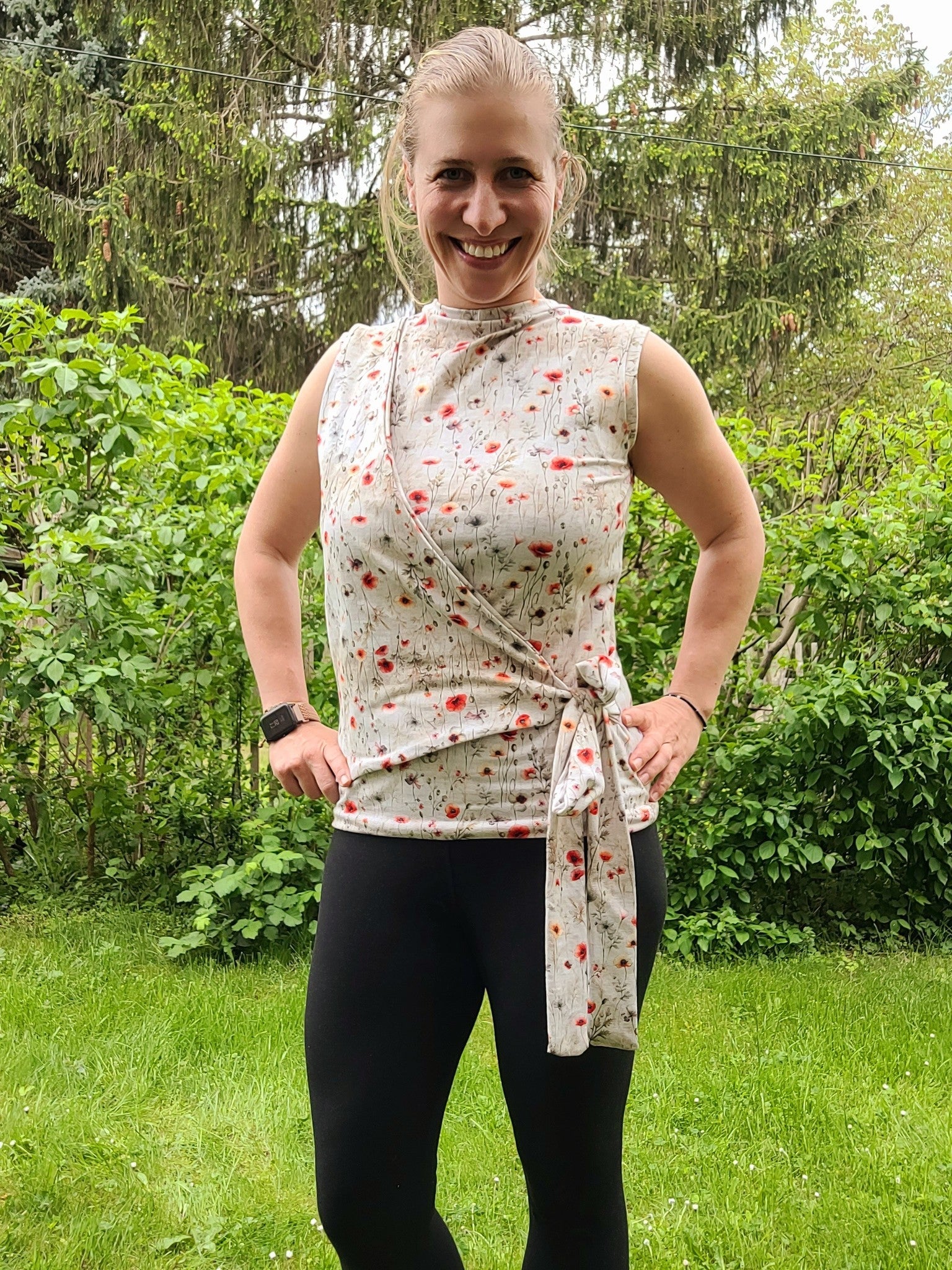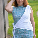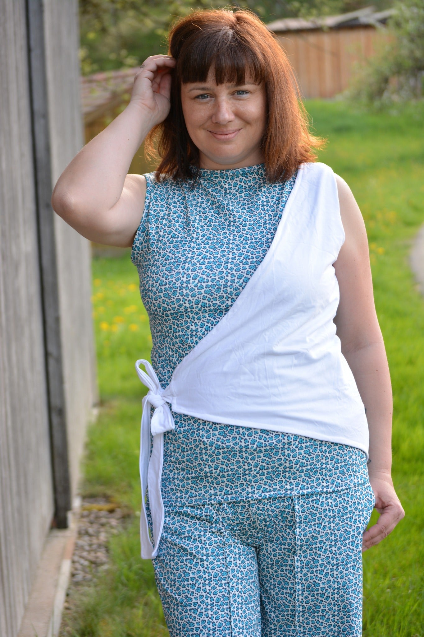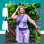 Das Schnittmuster BlueWionna ist ein vielseitiges, ärmelloses Fake-Wickelshirt, das durch seine raffinierte Optik und bequeme Passform überzeugt. Mit zwei Längenvarianten und einem seitlichen Bindeband lässt sich das Shirt individuell stylen – mal lässig, mal feminin. Es eignet sich perfekt für leichte Jerseys und ist damit ideal für Frühling und Sommer oder als Layering-Teil das ganze Jahr über.