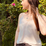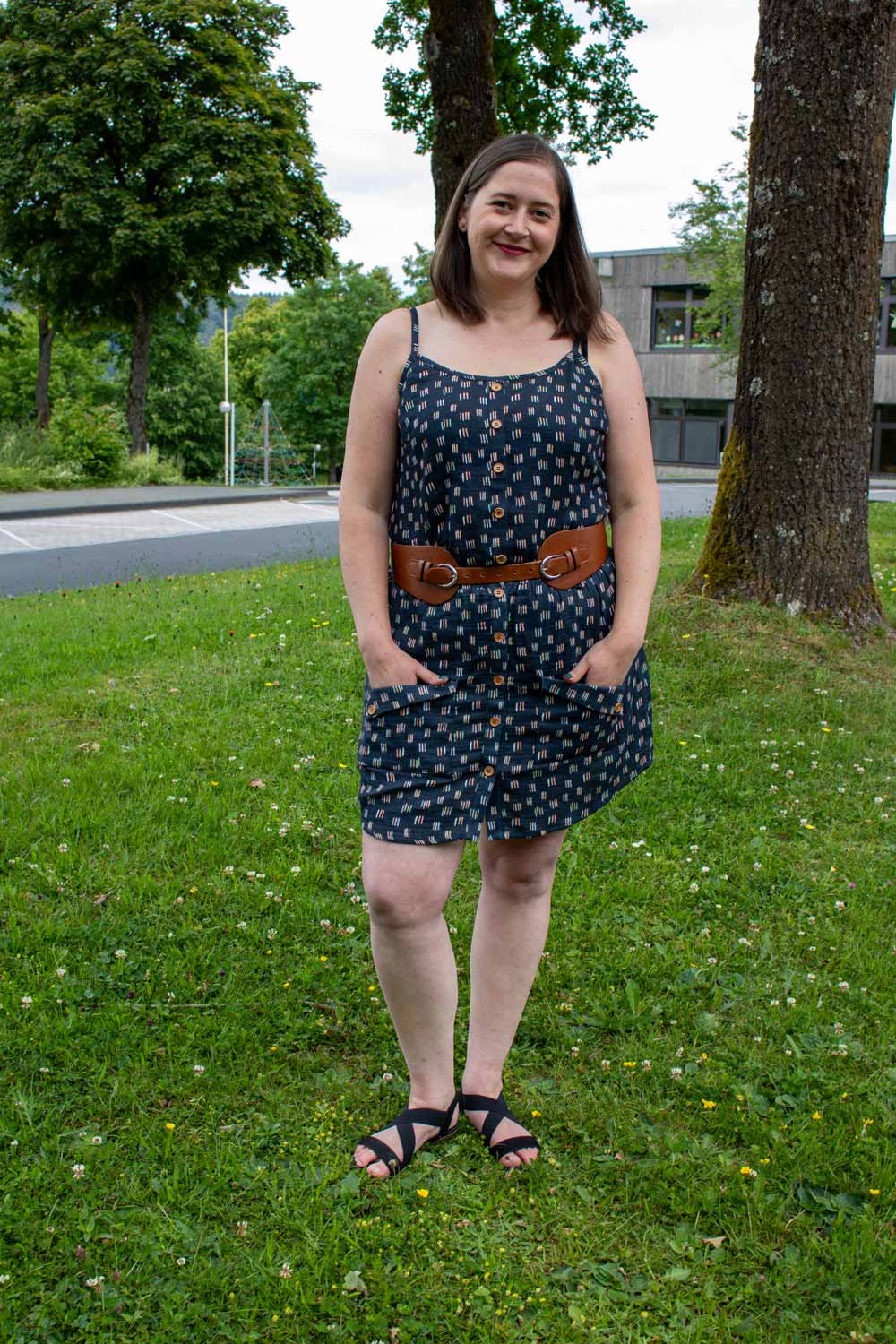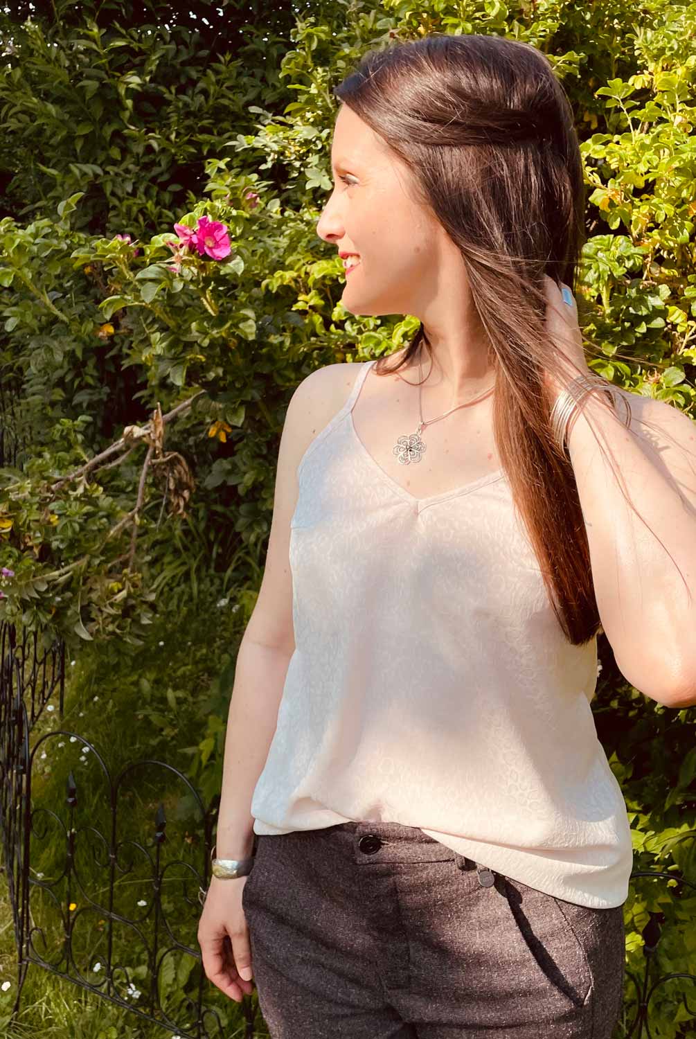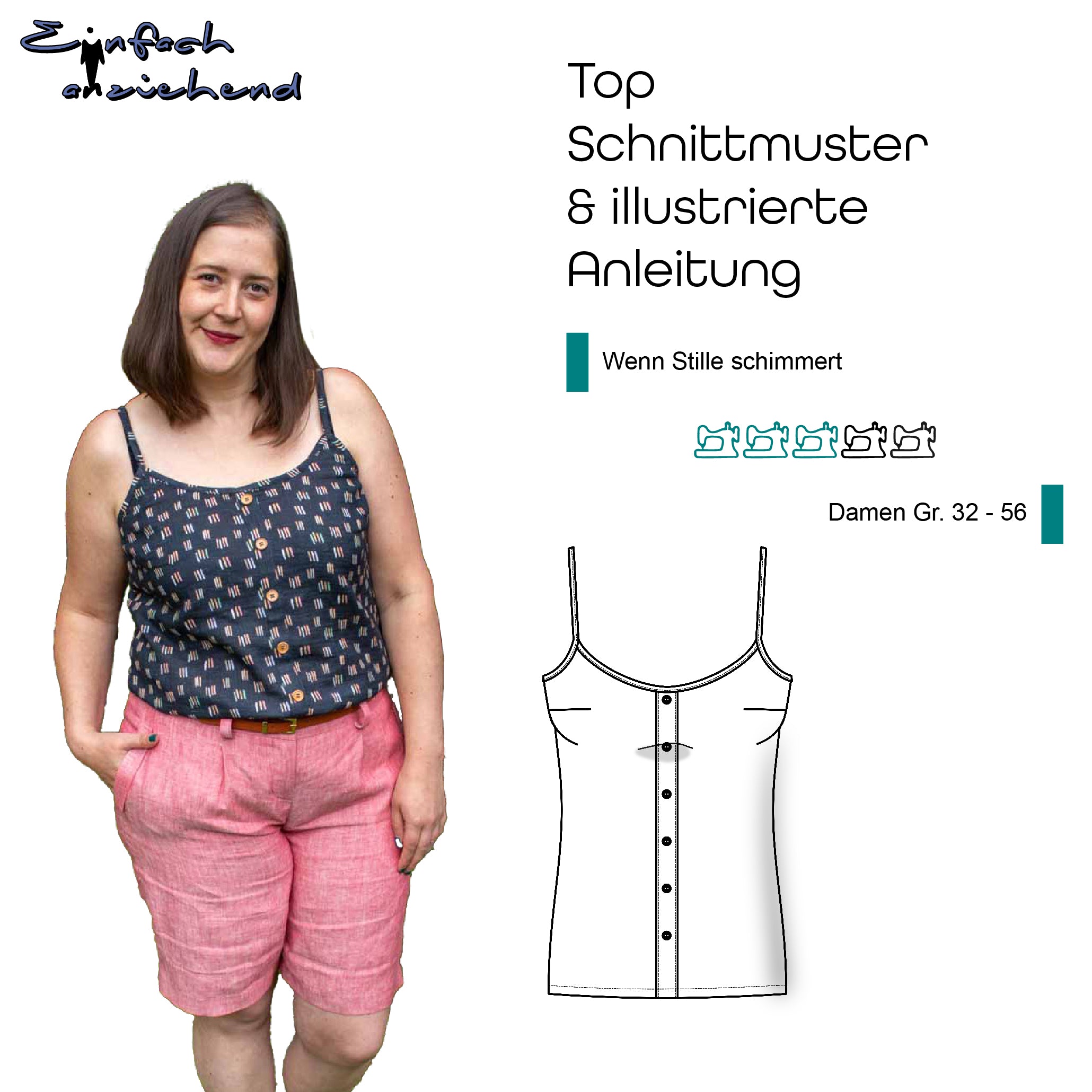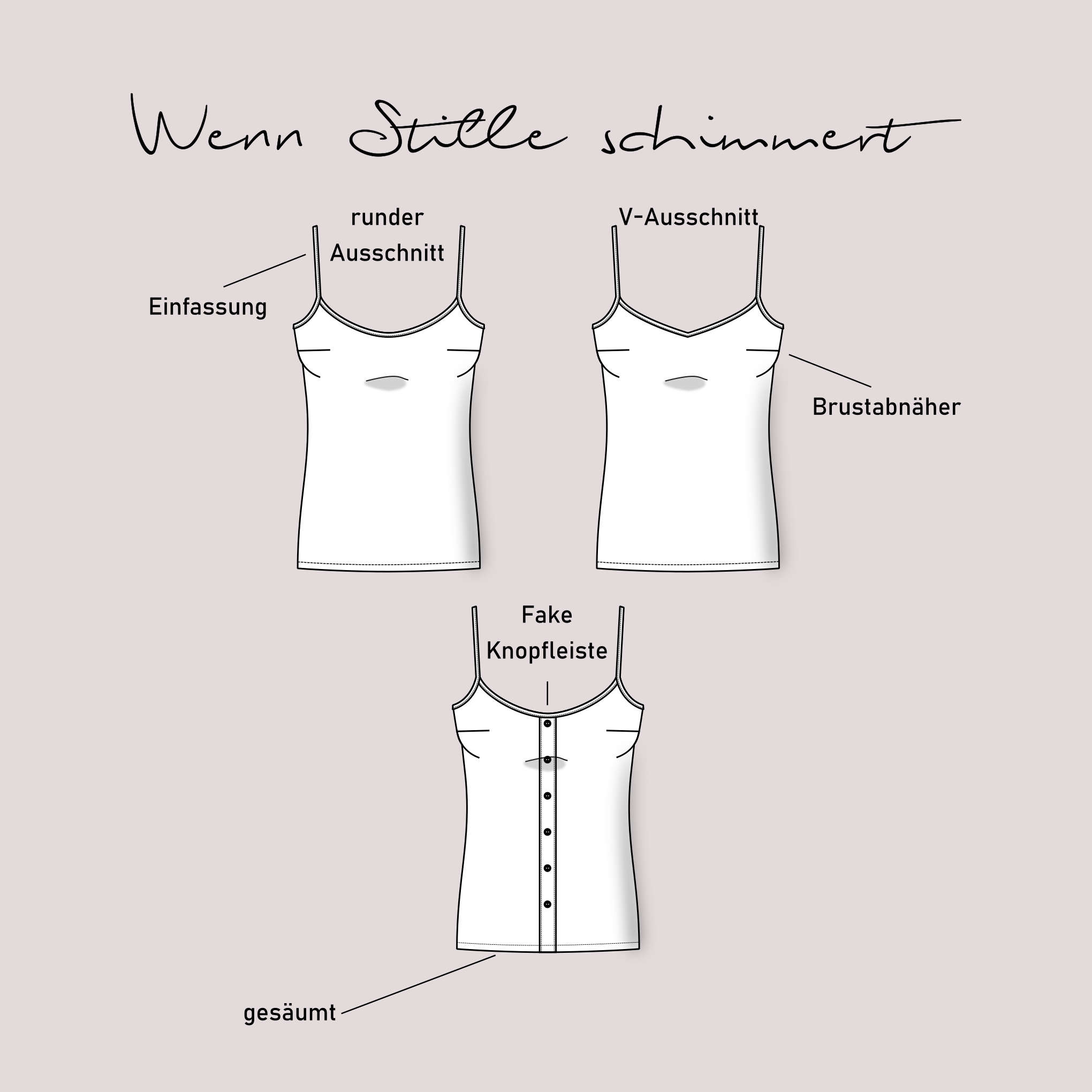 Dieser Schnitt für ein Spaghetti Träger Top aus Webware mit rundem Ausschnitt vorne oder V-Ausschnitt und einer optionalen Fake-Knopfleiste, trägt den schönen Namen "Wenn Stille schimmert". Das Schnittmuster beinhaltet natürlich eine ausführliche Anleitung und die Damen Größen 32 - 56 und wird dir nach dem Kauf als Sofort Download in PDF Format zur Verfügung gestellt.