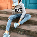 Das breite, runde Halsbündchen und die Kapuze sorgen für einen gemütlichen Look.