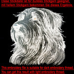 - Für realistische Stickdateien sind deutlich mehr Stiche als gewöhnlich nötig, damit sie ein schönes und detailreiches Ergebnis erhalten. Mit einem dickeren Garn und einer dickeren Nadel kann das Ergebnis unscharf und konturlos wirken. Zudem kann der Faden schneller reißen. Die Datei sollte auf einen festen Stoff sowie ein stabiles Stickvlies gestickt werden.