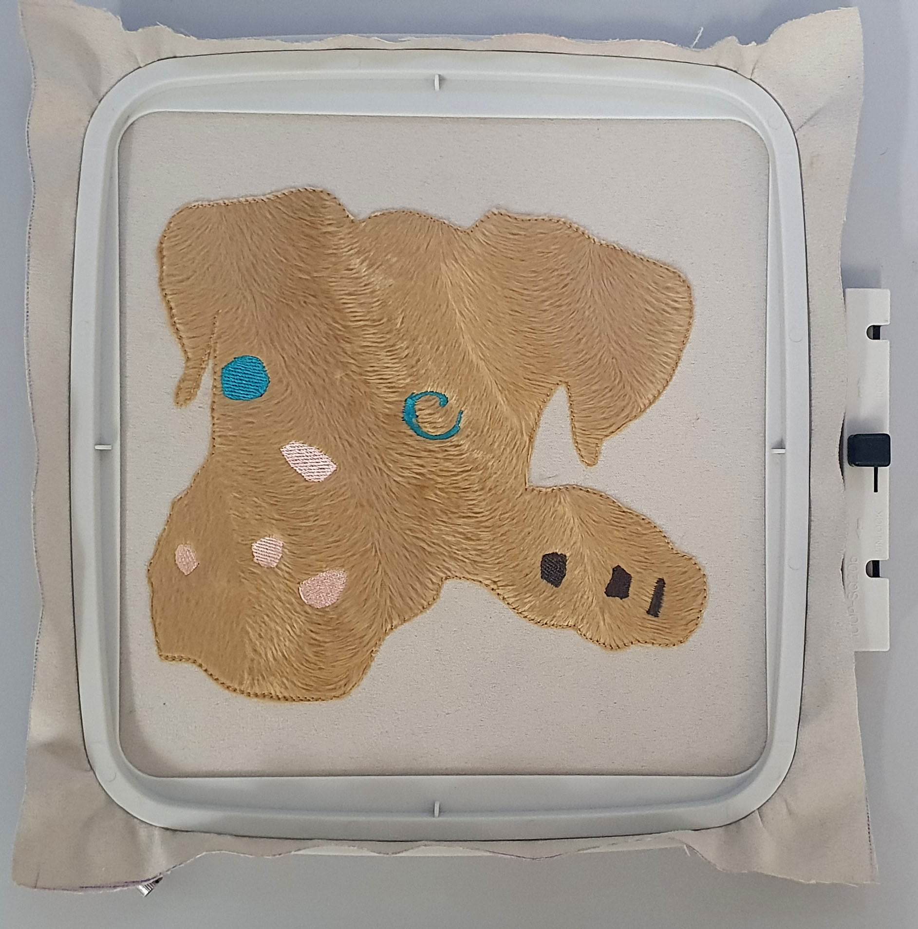 - Es handelt sich um eine Applikation, in der dein farbiger Stoff eingestickt wird. Ich habe auf den Bildern ein Tierfell-Imitat benutzt.