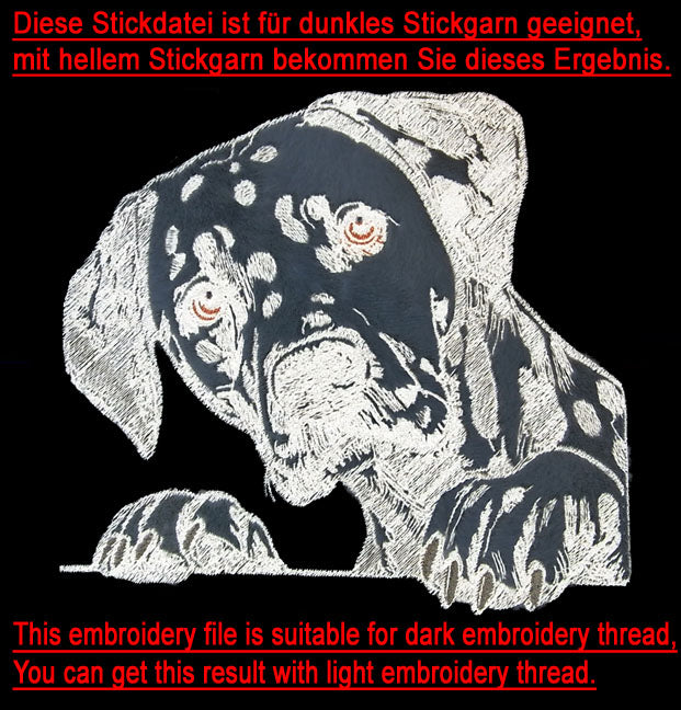 - Es handelt sich um eine Applikation, in der dein farbiger Stoff eingestickt wird. Ich habe auf den Bildern ein Tierfell-Imitat benutzt. Eine detaillierte, bebilderte PDF-Anleitung in Deutsch und Englisch, sowie ein Link zu einem Video-Tutorial (deutsch, englisch und spanisch), ist im Download enthalten.