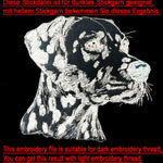 - Für realistische Stickdateien sind deutlich mehr Stiche als gewöhnlich nötig, damit sie ein schönes und detailreiches Ergebnis erhalten. Mit einem dickeren Garn und einer dickeren Nadel kann das Ergebnis unscharf und konturlos wirken. Zudem kann der Faden schneller reißen. Die Datei sollte auf einen festen Stoff sowie ein stabiles Stickvlies gestickt werden.