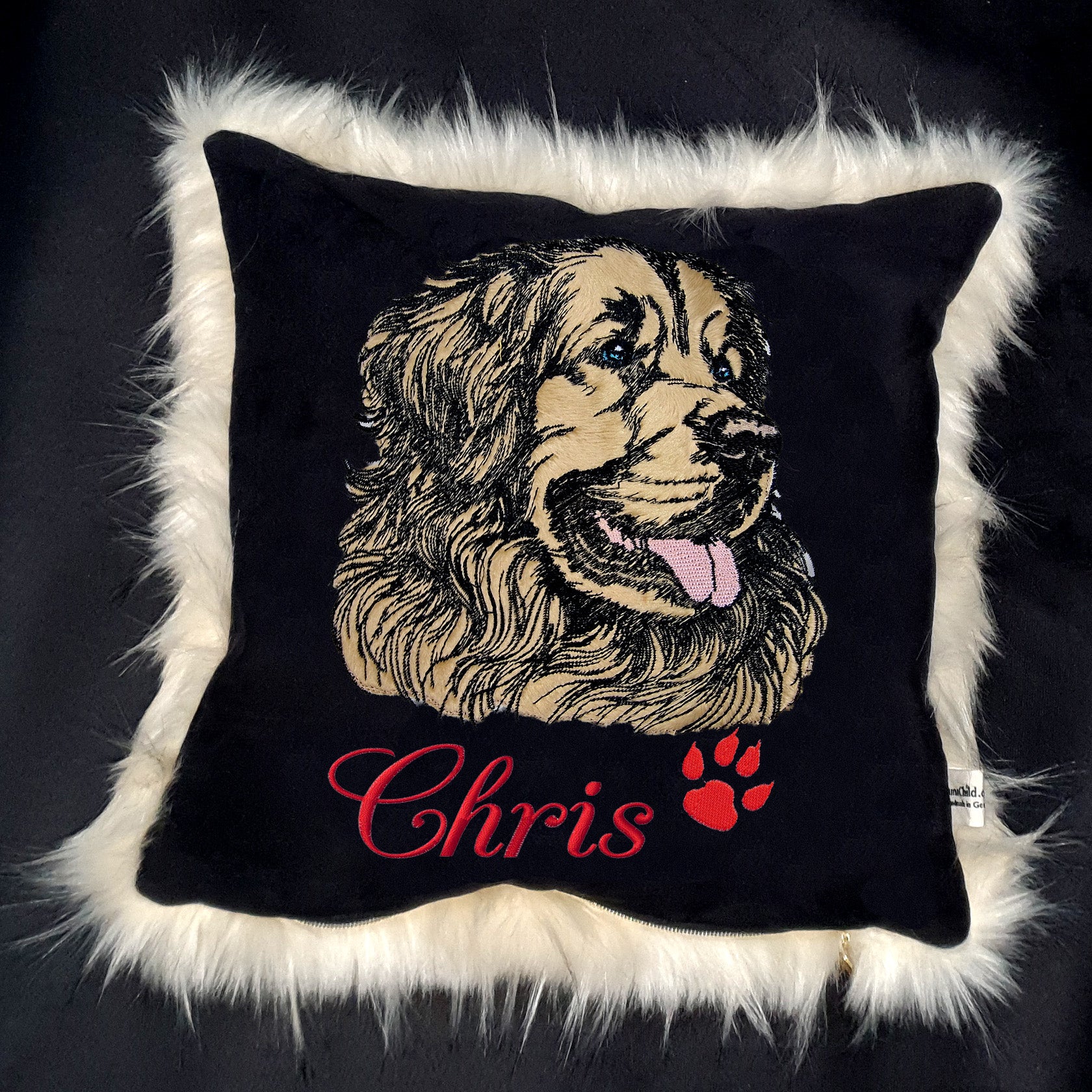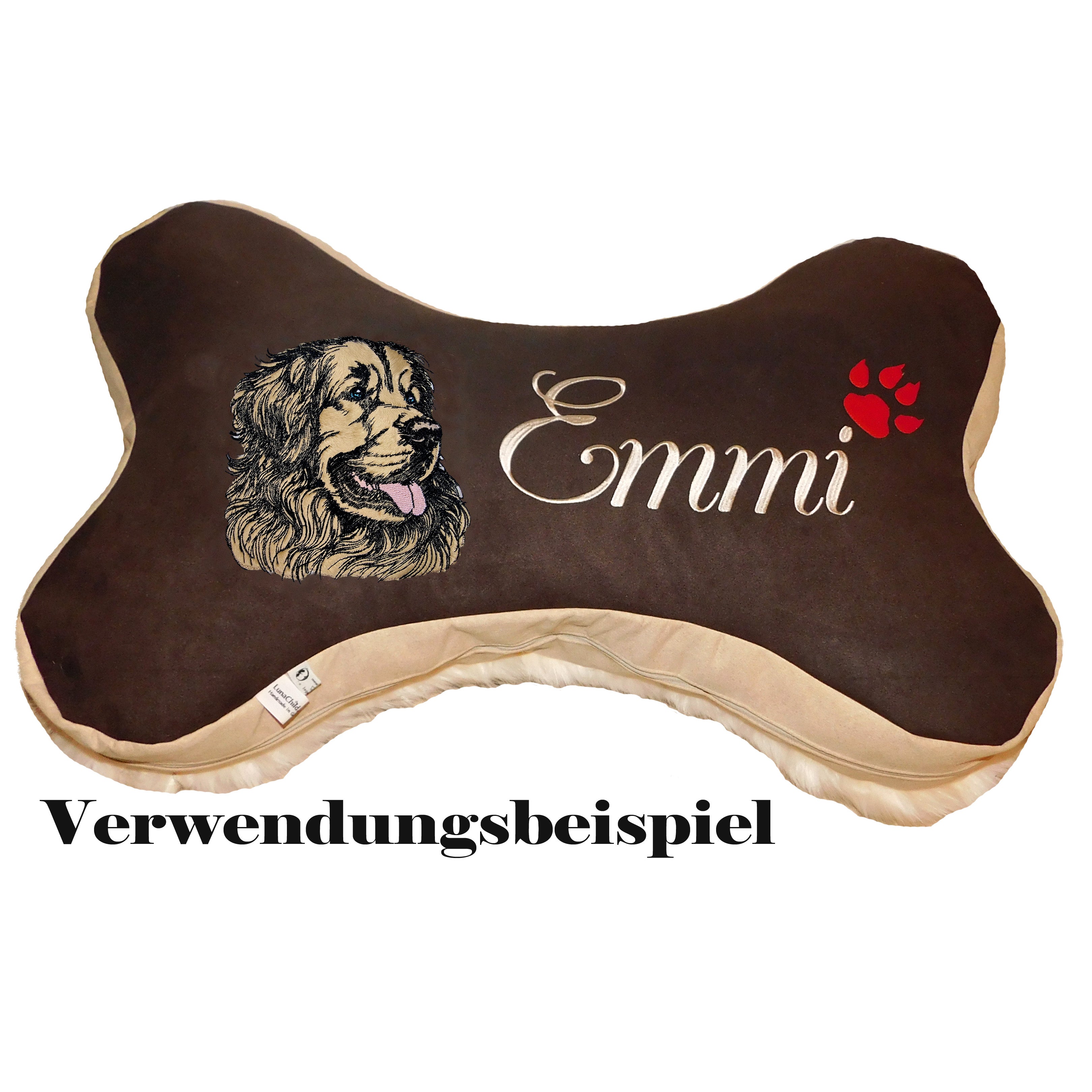 - Es handelt sich um eine Applikation, in der dein farbiger Stoff eingestickt wird. Ich habe auf den Bildern ein Tierfell-Imitat benutzt.