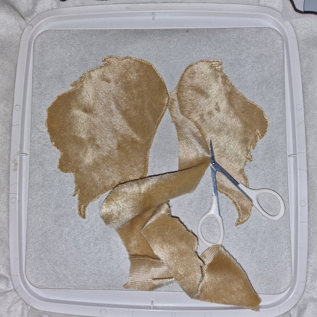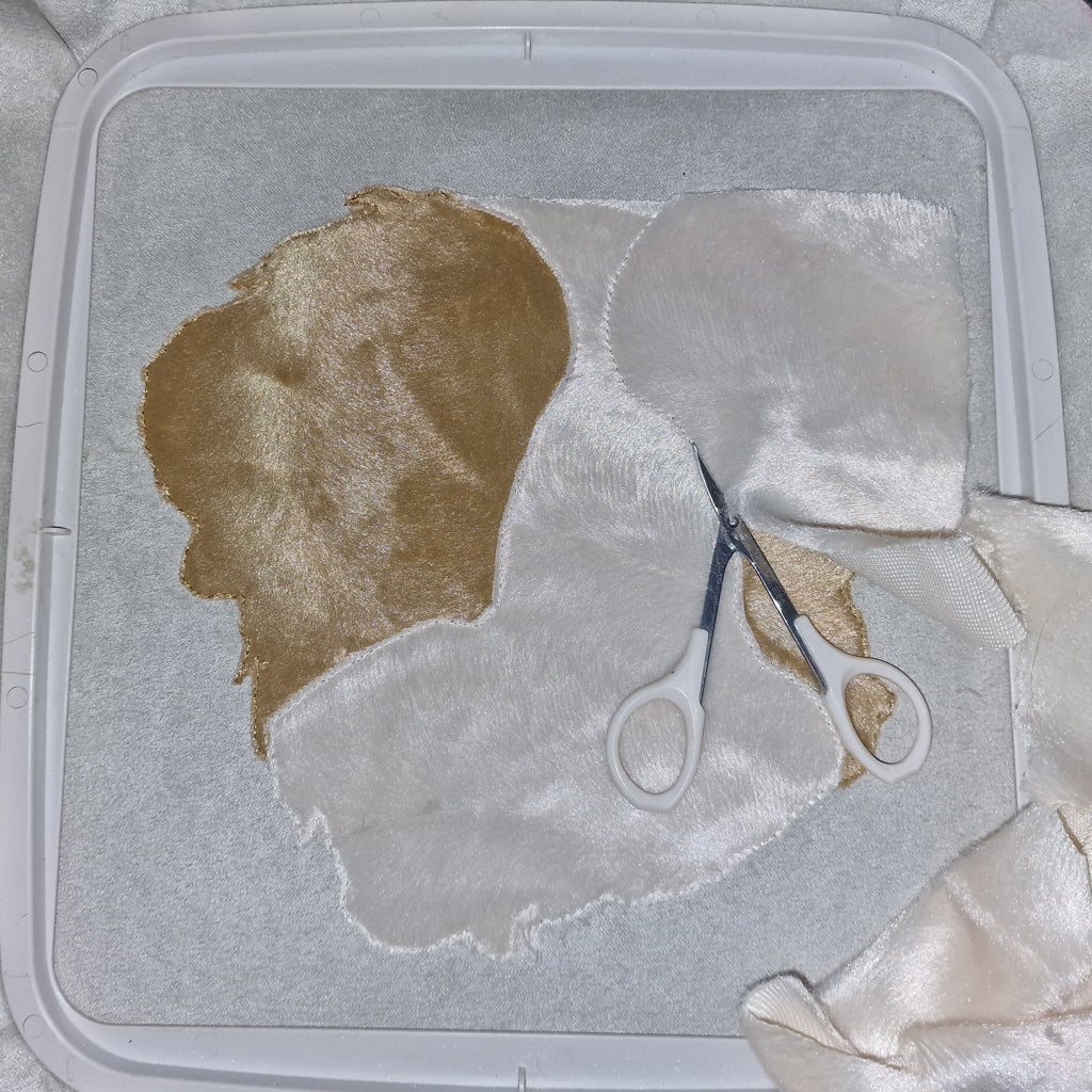 - Es handelt sich um eine Applikation, in der dein farbiger Stoff eingestickt wird. Ich habe auf den Bildern ein Tierfell-Imitat benutzt.