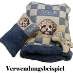 - Es handelt sich um eine Applikation, in der dein farbiger Stoff eingestickt wird. Ich habe auf den Bildern ein Tierfell-Imitat benutzt.