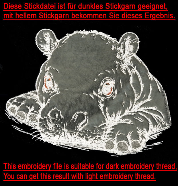 - Für realistische Stickdateien sind deutlich mehr Stiche als gewöhnlich nötig, damit sie ein schönes und detailreiches Ergebnis erhalten. Mit einem dickeren Garn und einer dickeren Nadel kann das Ergebnis unscharf und konturlos wirken. Zudem kann der Faden schneller reißen. Die Datei sollte auf einen festen Stoff sowie ein stabiles Stickvlies gestickt werden.