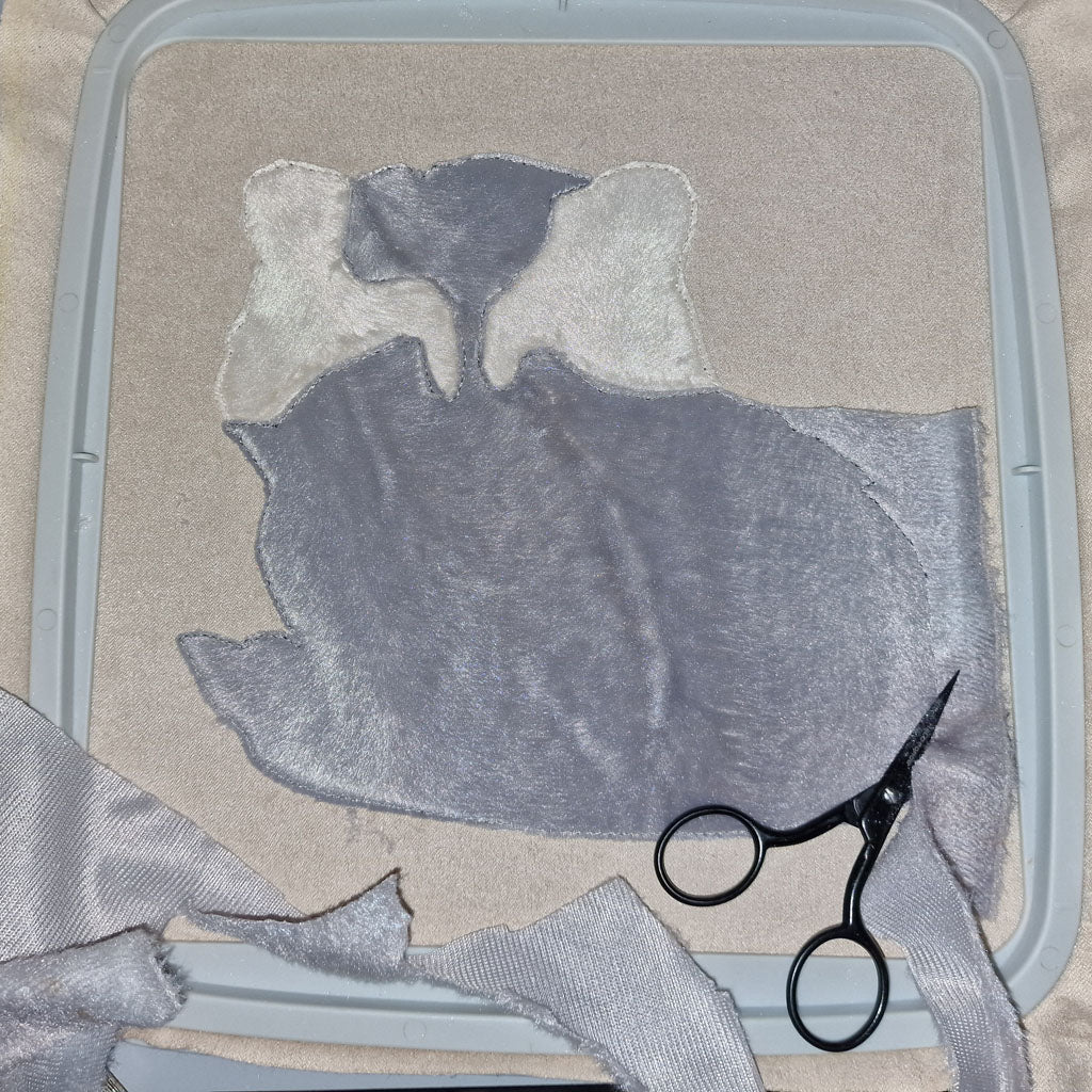 - Es handelt sich um eine Applikation, in der dein farbiger Stoff eingestickt wird. Ich habe auf den Bildern ein Tierfell-Imitat benutzt.