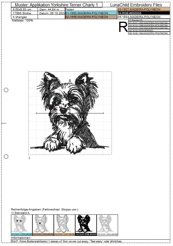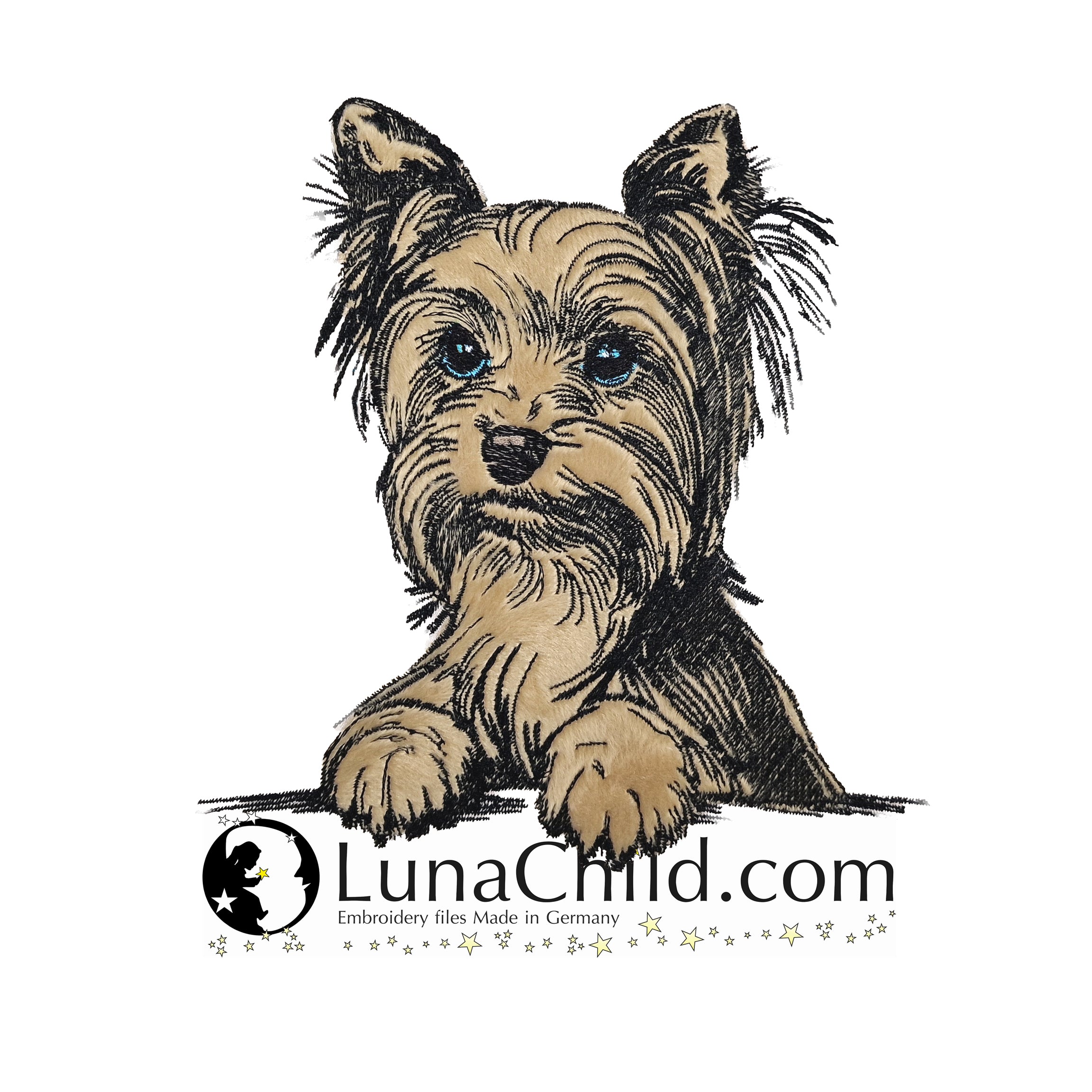 🐕Die Stickdatei Hunderasse Yorkshire Terrier "Charly" als Applikation von Lunachild ist ideal für Hundeliebhaber. Mit dieser detaillierten Datei kannst du den süßen Yorki auf Kleidung, Taschen und mehr verewigen. Perfekt für kreative Projekte und ein einzigartiges Design!🐕