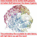 AUFWENDIGE Stickdatei, die in die Richtung Fotostich geht, die Stickzeit bei Größe 5 auf einer Janome 550 E beträgt (bei einer Stickgeschwindigkeit von 860 Stichen in der Minute) 106 Minuten. Es fallen viele Spannfäden an, die nach JEDER Farbe abgeschnitten werden müssen