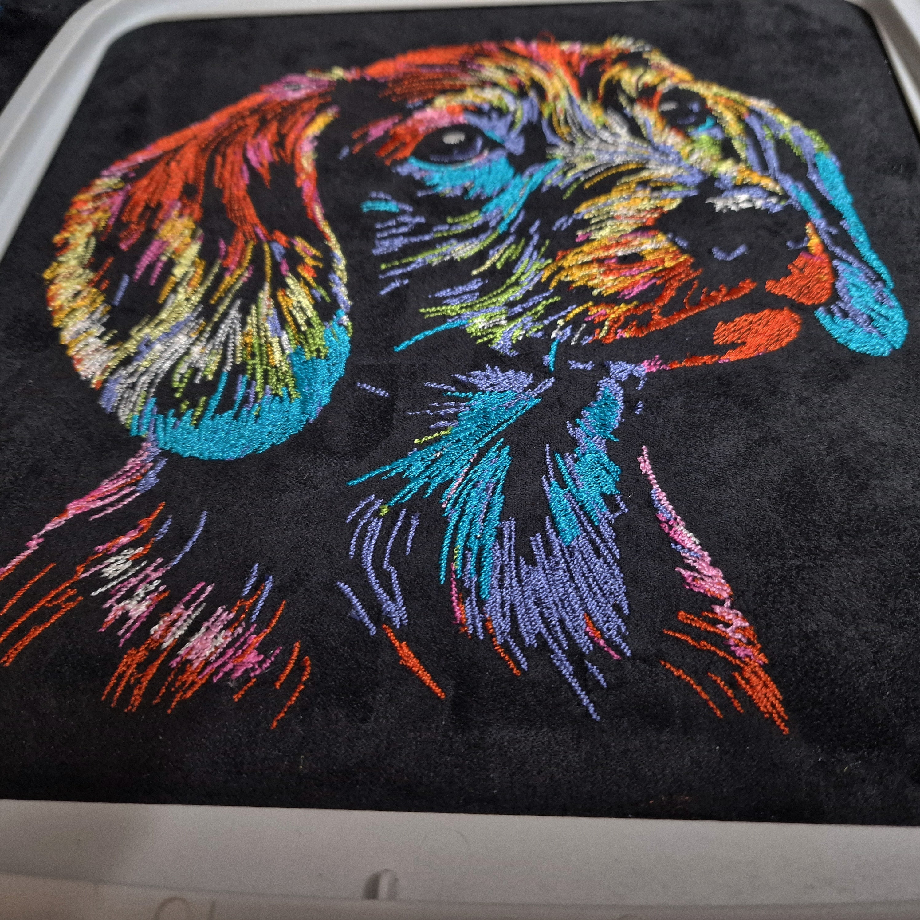 AUFWENDIGE Stickdatei, die in die Richtung Fotostich geht, die Stickzeit bei Größe 5 auf einer Janome 550 E beträgt (bei einer Stickgeschwindigkeit von 860 Stichen in der Minute) 84 Minuten. Es fallen viele Spannfäden an, die nach JEDER Farbe abgeschnitten werden müssen
