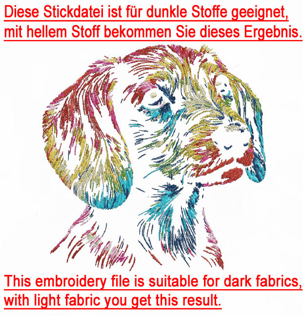 - Für realistische Stickdateien sind deutlich mehr Stiche als gewöhnlich nötig, damit sie ein schönes und detailreiches Ergebnis erhalten. Mit einem dickeren Garn und einer dickeren Nadel kann das Ergebnis unscharf und konturlos wirken. Zudem kann der Faden schneller reißen. Die Datei sollte auf einen festen Stoff sowie ein stabiles Stickvlies gestickt werden.