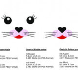 Jede Größe ist einmal komplett mit Augen und je einmal nur als Mund enthalten - insgesamt 6 Stickdateien.