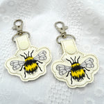 Schnell gestickte Anhänger. Es werden immer zwei Schlüsselanhänger mit der kleinen Hummel gestickt: entweder mit gestickter Öse oder als Anhänger für Druckknöpfe im 10x10cm Stickrahmen.