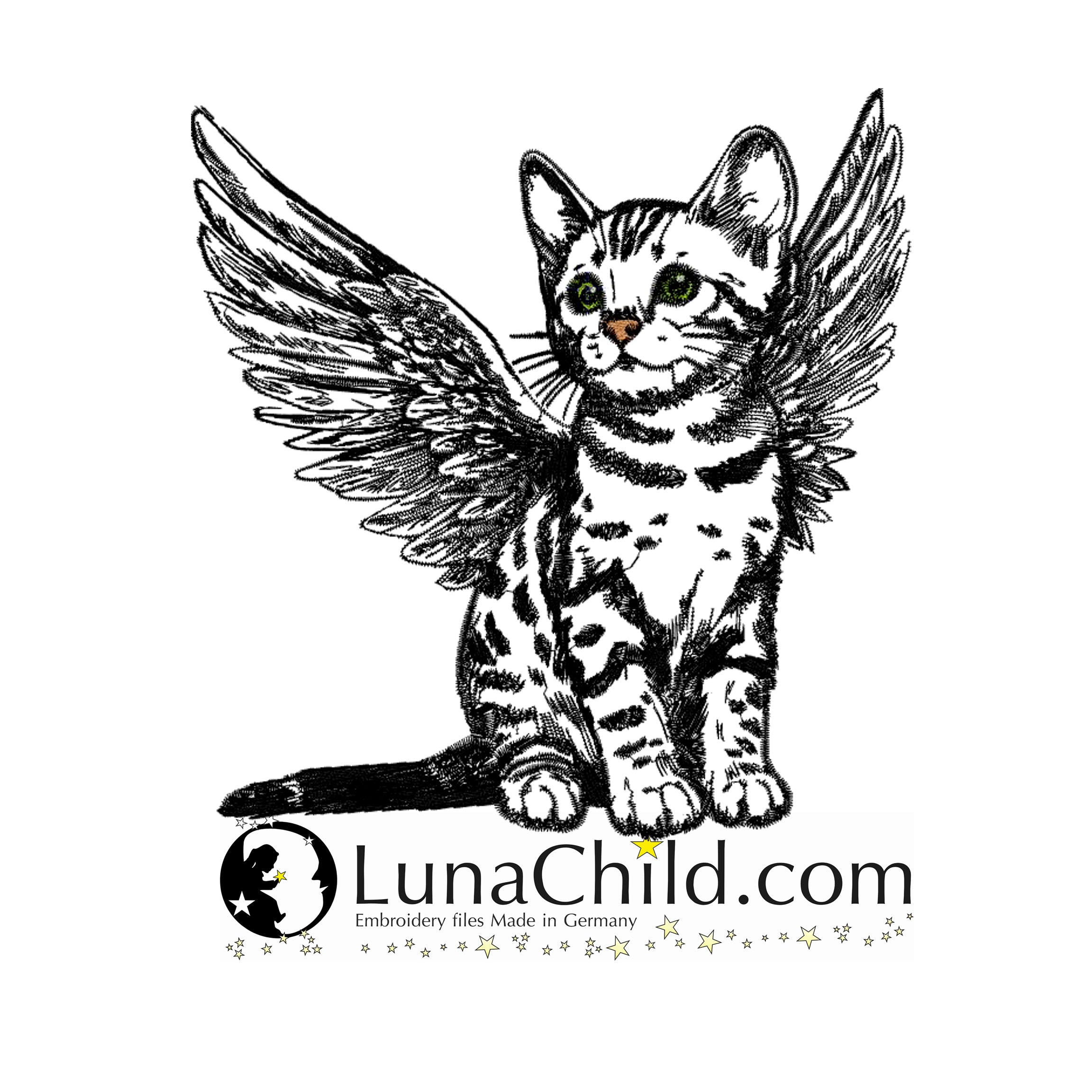 🐈⬛Die Stickdatei Katzenrasse Bengalen Memorial Katzenengel mit Flügel "Hanni" von Lunachild ist ideal für Hundeliebhaber. Mit dieser detaillierten Datei kannst du das süße Kätzchen auf Kleidung, Taschen, Kissen und mehr verewigen. Perfekt für kreative Projekte und ein einzigartiges Design! 🐈⬛