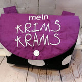 Die Lenkertasche darf mit und ohne Deckel gestickt werden. Der Deckel ist einmal als blanko Datei und einmal mit dem Spruch "meinKrimsKrams" enthalten.
