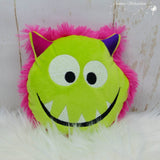 Das Monsterchen wird komplett im Stickrahmen in the Hoop gestickt. Lediglich die kleine Wendeöffnung wird dann per Hand oder mit der Nähmaschine verschlossen. Mit Wunschmaterial gestopft wird es ein tolles Kissen, ungefüllt ein witziges Kuscheltuch.
