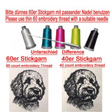 - Für realistische Stickdateien sind deutlich mehr Stiche als gewöhnlich nötig, damit sie ein schönes und detailreiches Ergebnis erhalten. Mit einem dickeren Garn und einer dickeren Nadel kann das Ergebnis unscharf und konturlos wirken. Zudem kann der Faden schneller reißen. Die Datei sollte auf einen festen Stoff sowie ein stabiles Stickvlies gestickt werden.