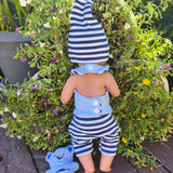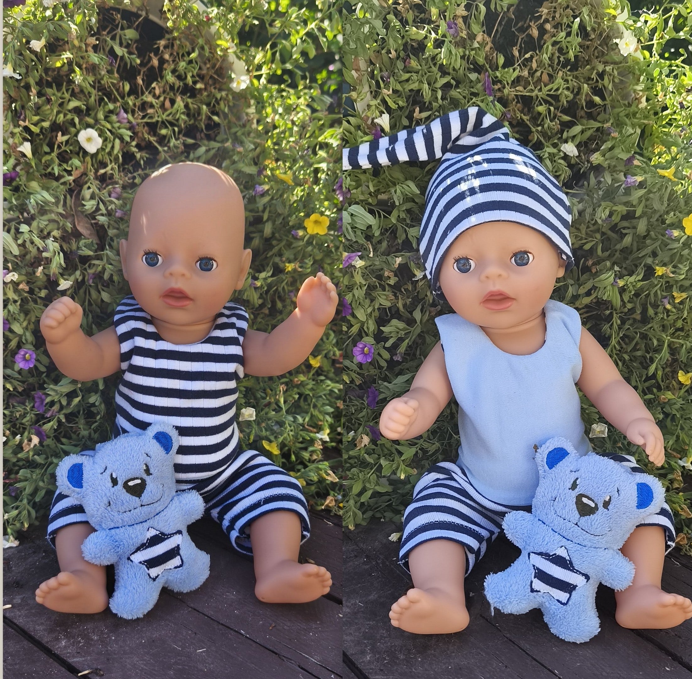 zuckersüßes Set für jede Puppenmutti, das Set besteht aus einer Mütze, einem Oberteil, einem Teddy und einer kurzen Hose alles wird komplett im Stickrahmen erstellt