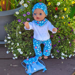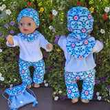 zuckersüßes Set für jede Puppenmutti, das Set besteht aus einer Mütze, einem Halstuch, einem Rucksack und einer langen Hose alles wird komplett im Stickrahmen erstellt