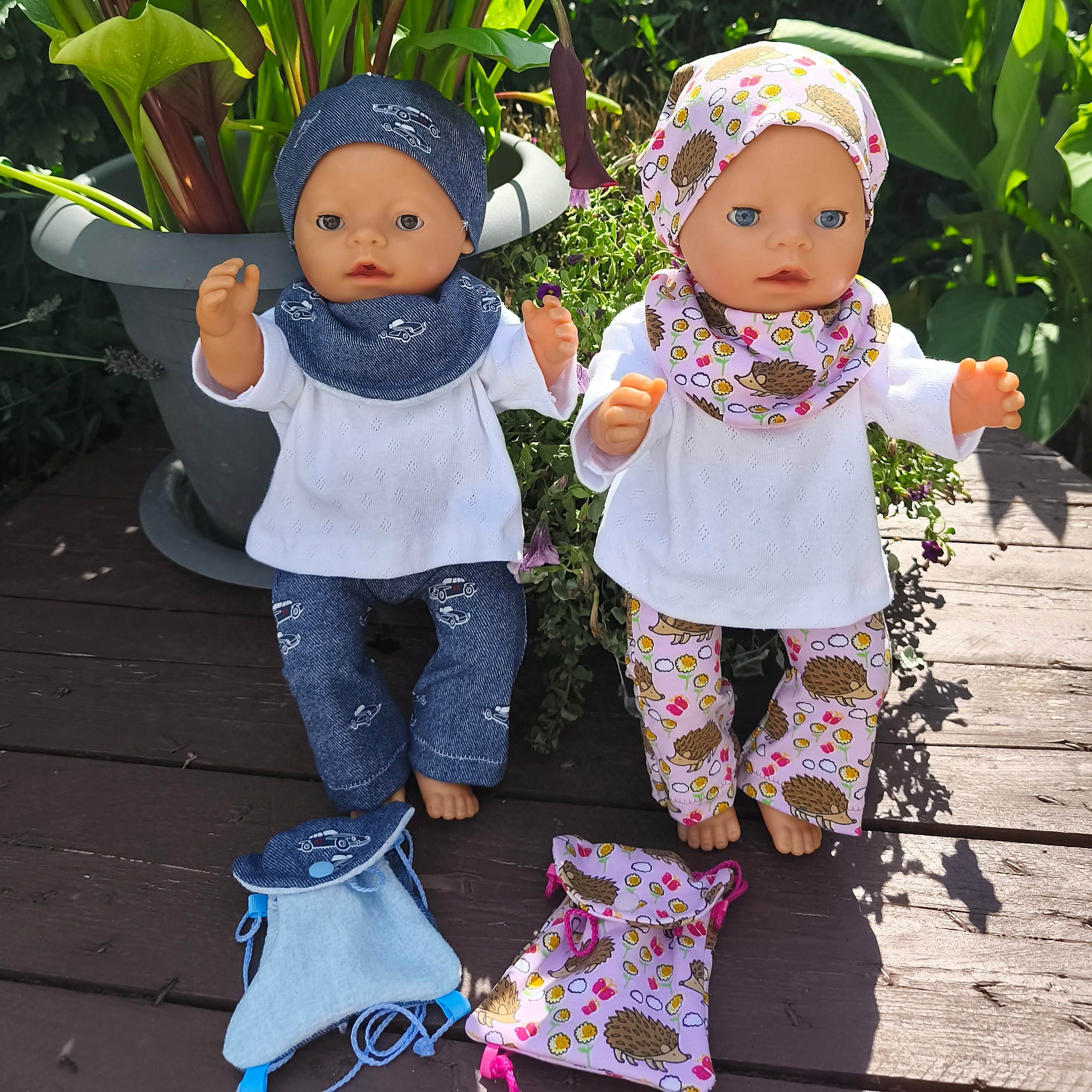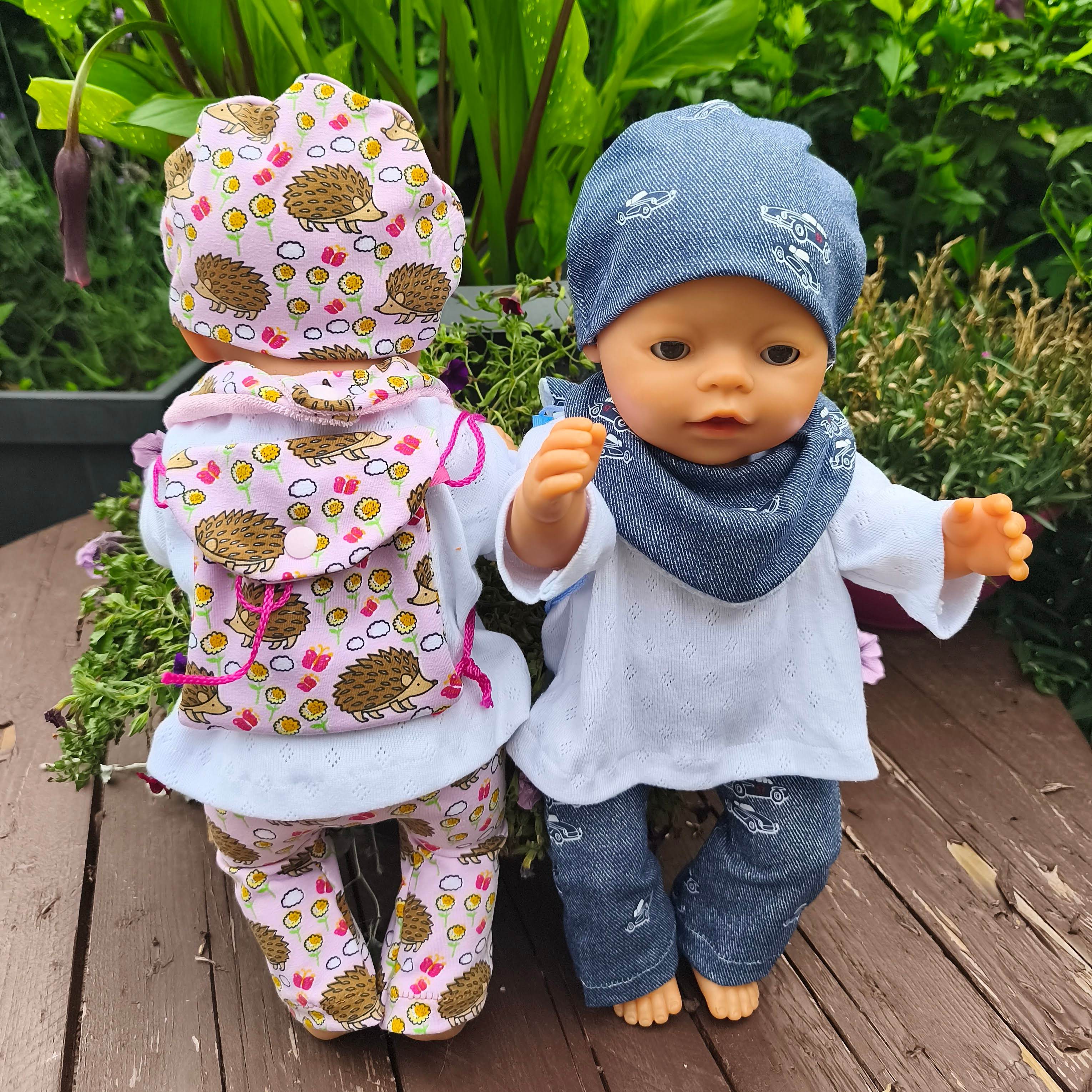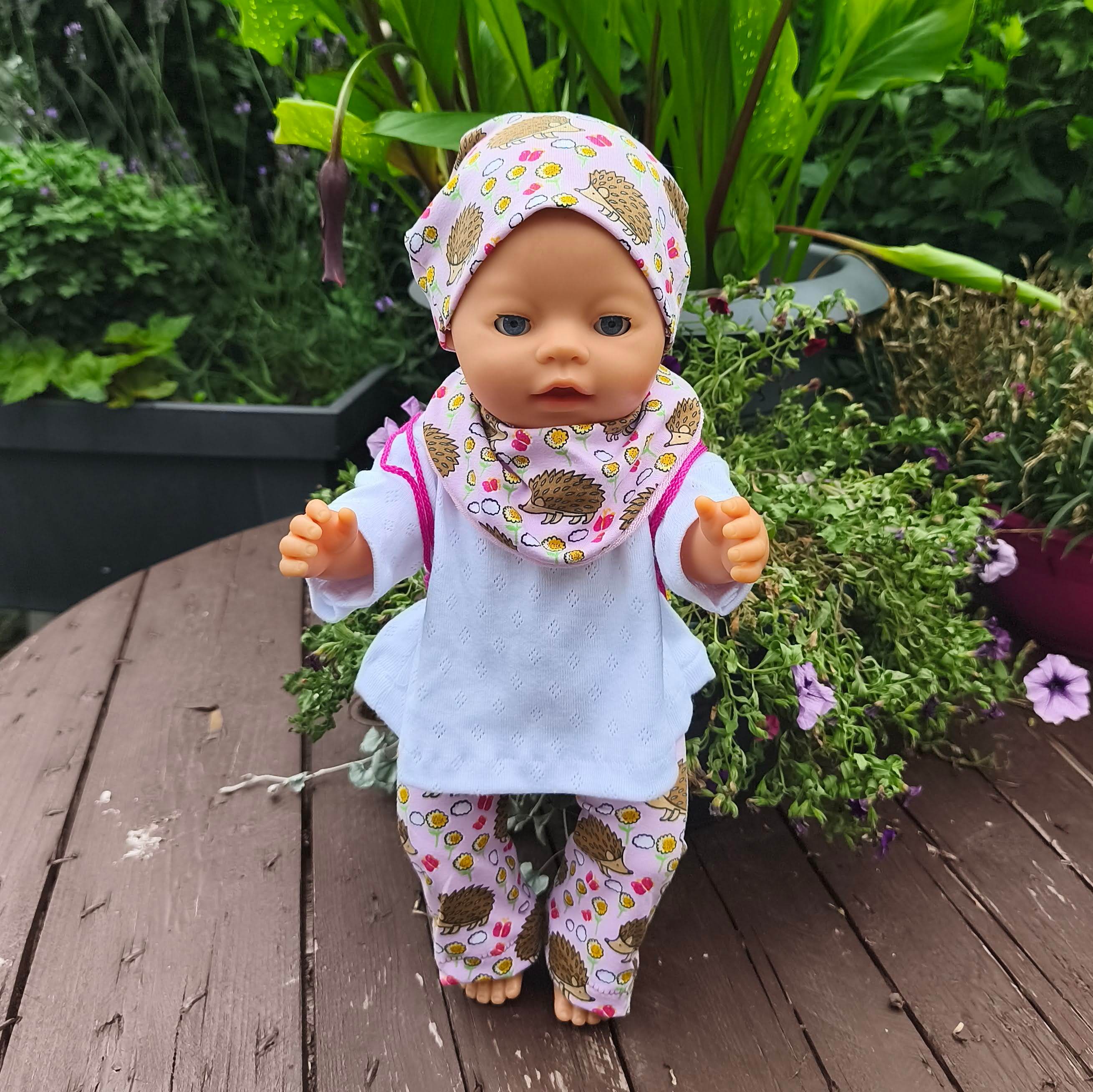 zuckersüßes Set für jede Puppenmutti, das Set besteht aus einer Mütze, einem Halstuch, einem Rucksack und einer langen Hose alles wird komplett im Stickrahmen erstellt