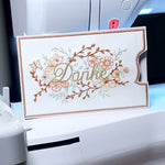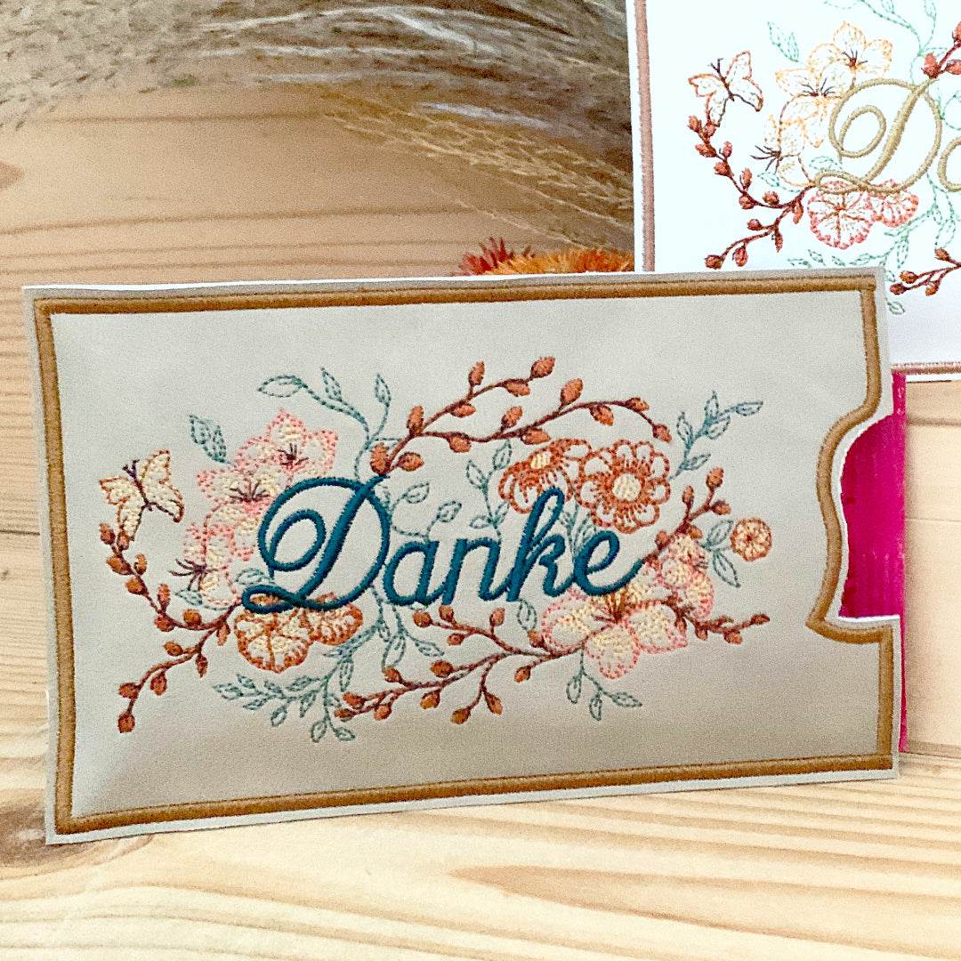 Hier bekommst du die ITH Schokohülle für den 13x18 Rahmen: mit aufgestickten Blumen und “Danke”