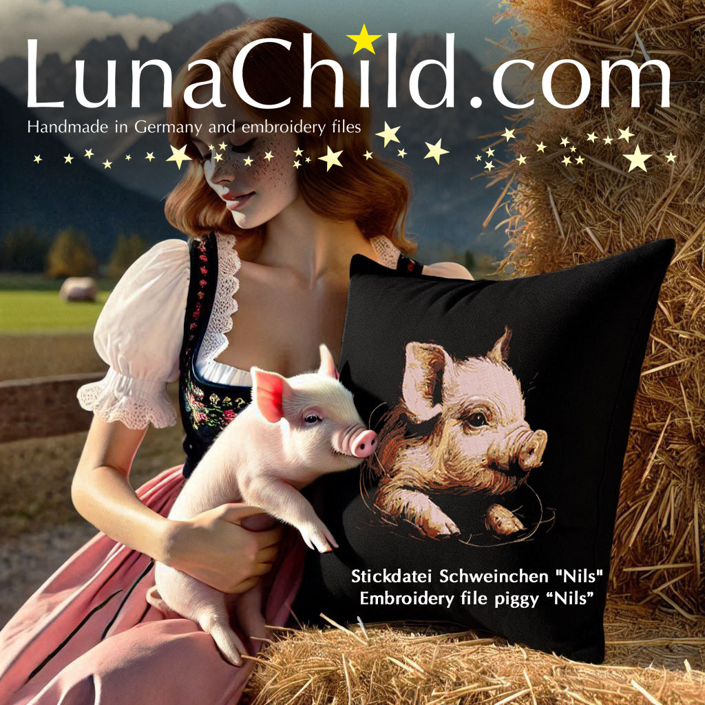 Die aufwendige Stickdatei Schweinchen "Nils" von Lunachild ist ideal für Tierliebhaber. Mit dieser detaillierten Datei kannst du das süße Glücksschwein auf Kleidung, Taschen und mehr verewigen. Perfekt für kreative Projekte und ein einzigartiges Design!