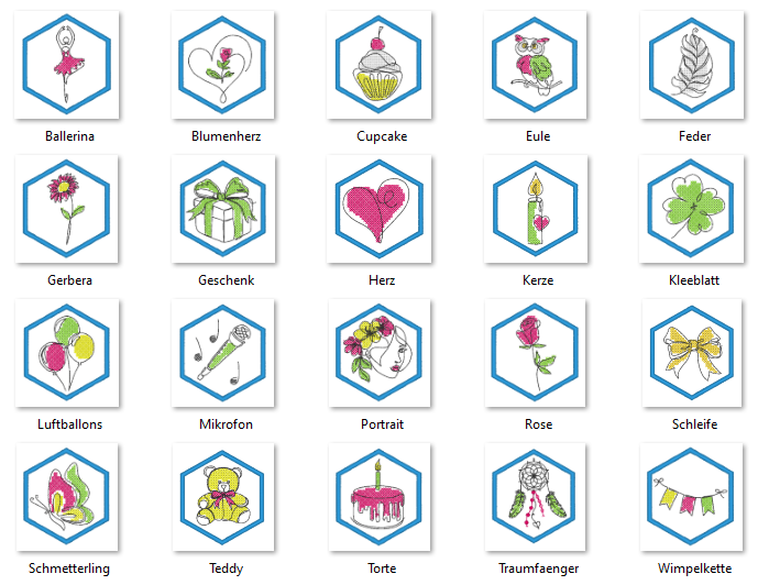 Der Zipordner enthält Dateien in den Stickformaten: DST, EXP, HUS, JEF, PES 9 und 10, VIP, XXX und VP3. Es handelt sich lediglich um digitale Stickdateien und NICHT um fertige Stickereien !!!