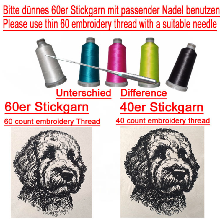 - 60er oder 40er Stickgarn (je nach Motivgröße und verwendeten Stoff dünne Stoffe, dünne Nadel)