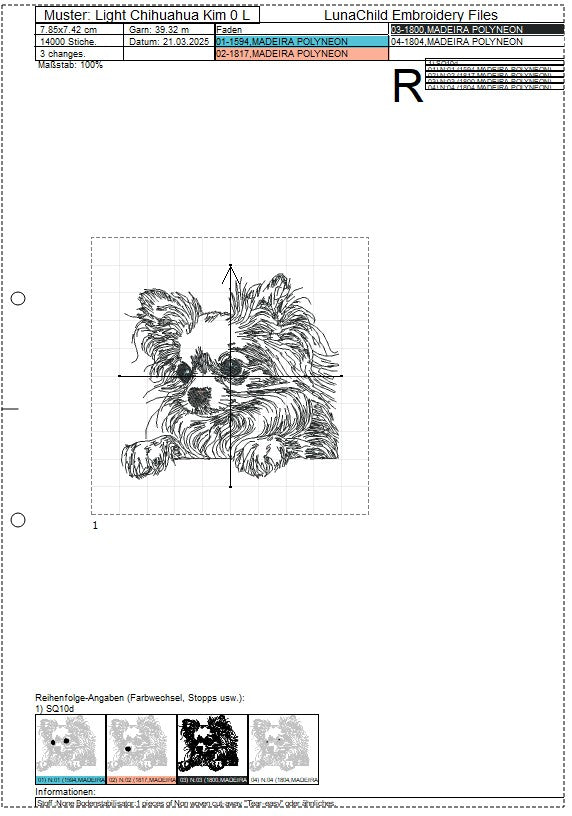 🐕Die Stickdatei Hunderasse Chihuahua "Kim" von Lunachild ist ideal für Hundeliebhaber. Mit dieser Datei kannst du den süßen Hund relativ schnell auf Kleidung, Taschen und mehr verewigen. Perfekt für kreative Projekte und ein einzigartiges Design!🐕