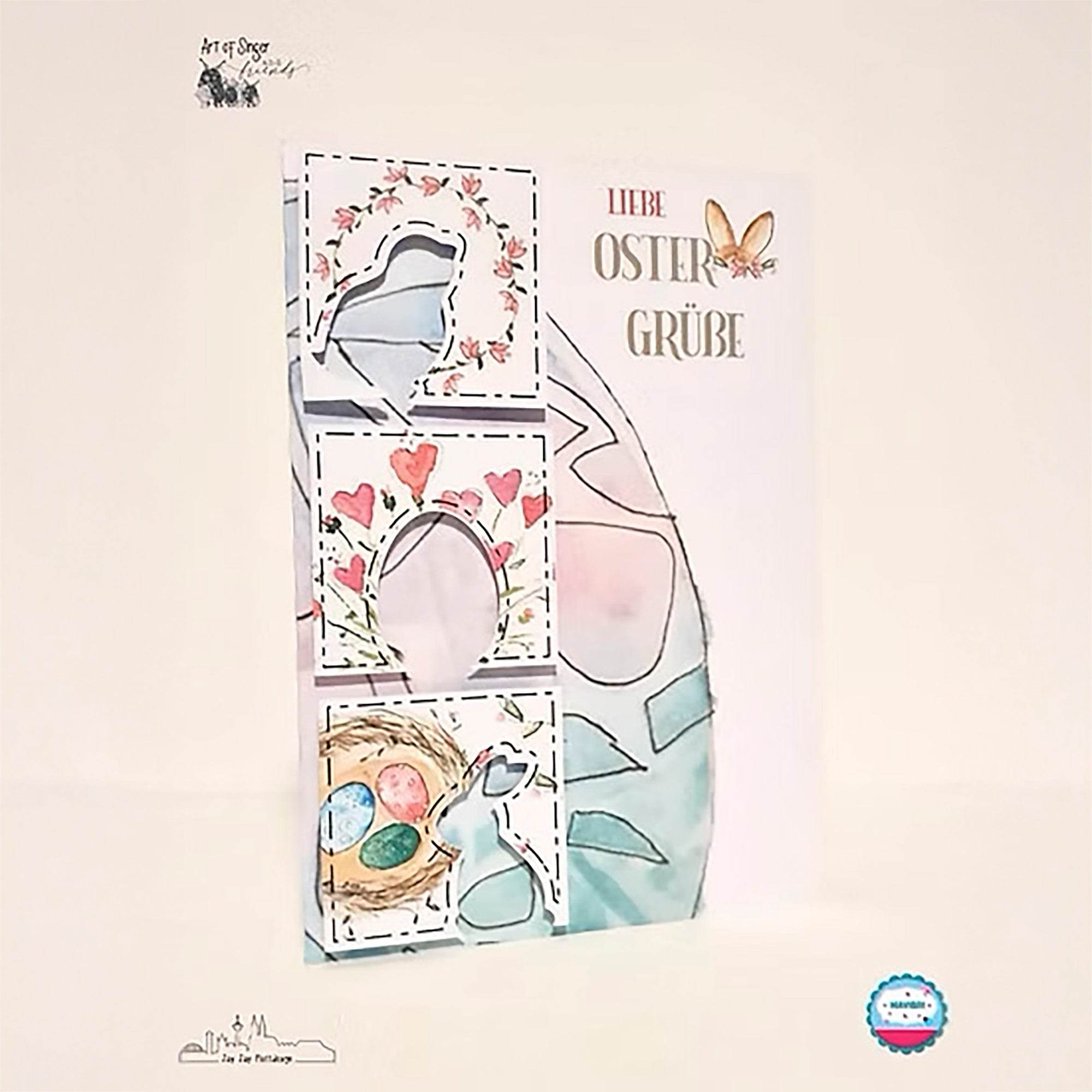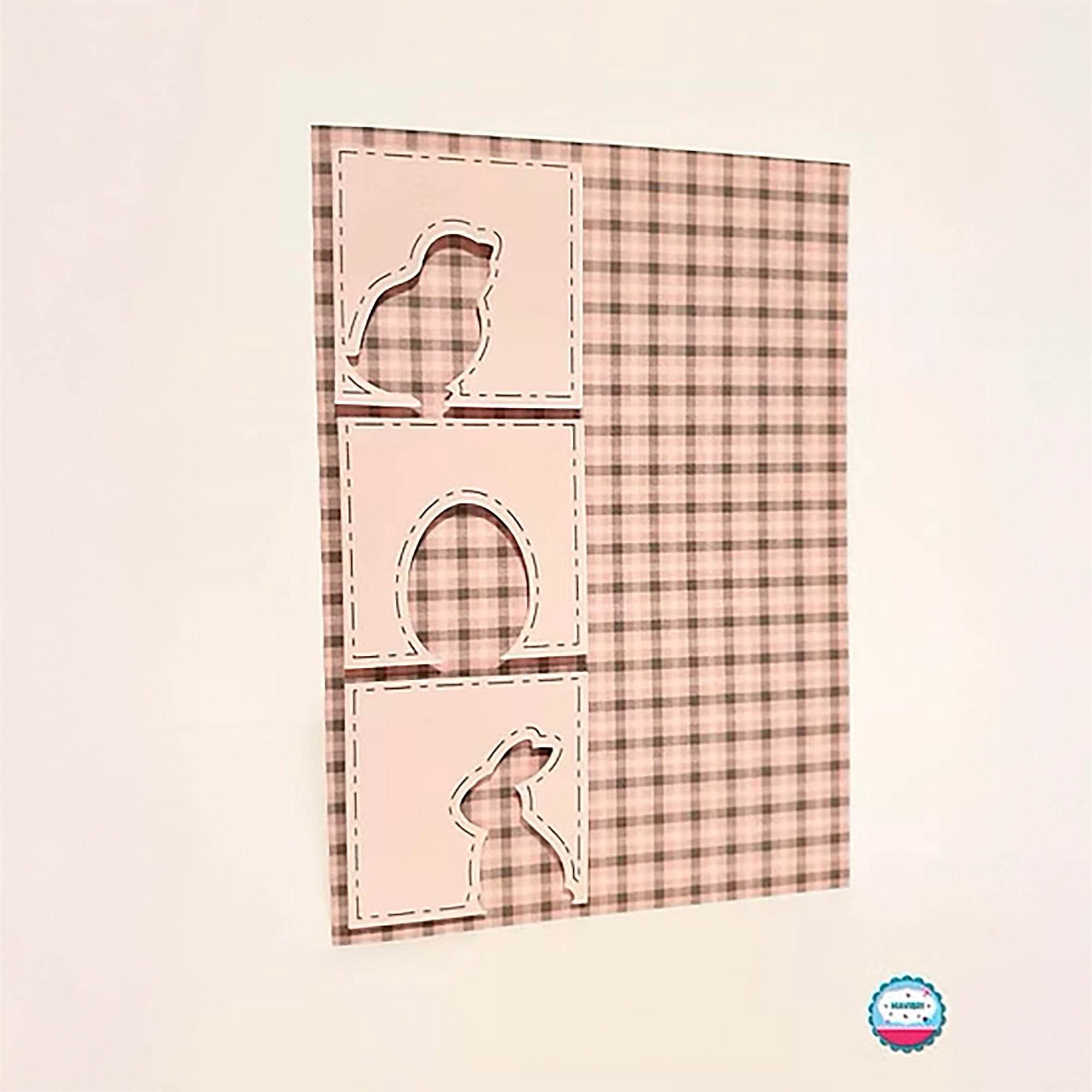 Diese liebevoll gestaltete Osterkarte im DIN A6-Format bringt gleich drei klassische Ostermotive mit: Küken, Osterei und Osterhase – als kleine quadratische Kartenaufleger mit ausgeschnittenen Silhouetten.