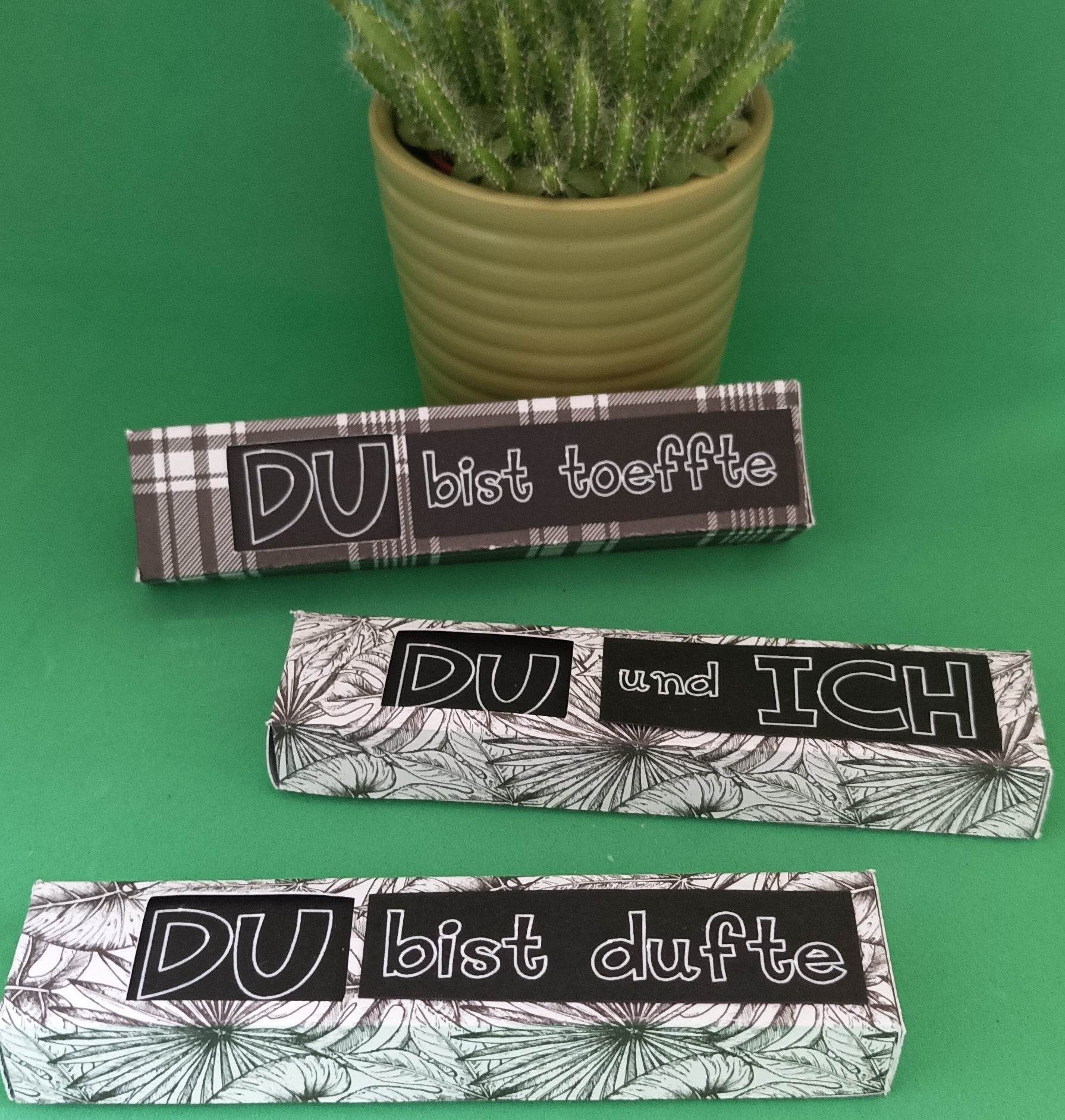 DU sind die ersten zwei Buchstaben einer berühmten Praline, die sich wunderbar mit unterschiedlichen Sprüchen ergänzen lässt. Dafür ist diese kleine Box gedacht. Mit wenig Material und viel Fantasie kannst du tolle Geschenke basteln. Wie wäre es mit einem Kompliment oder einem Mutmacher? Schaue dafür doch mal in die Designbeispiele.