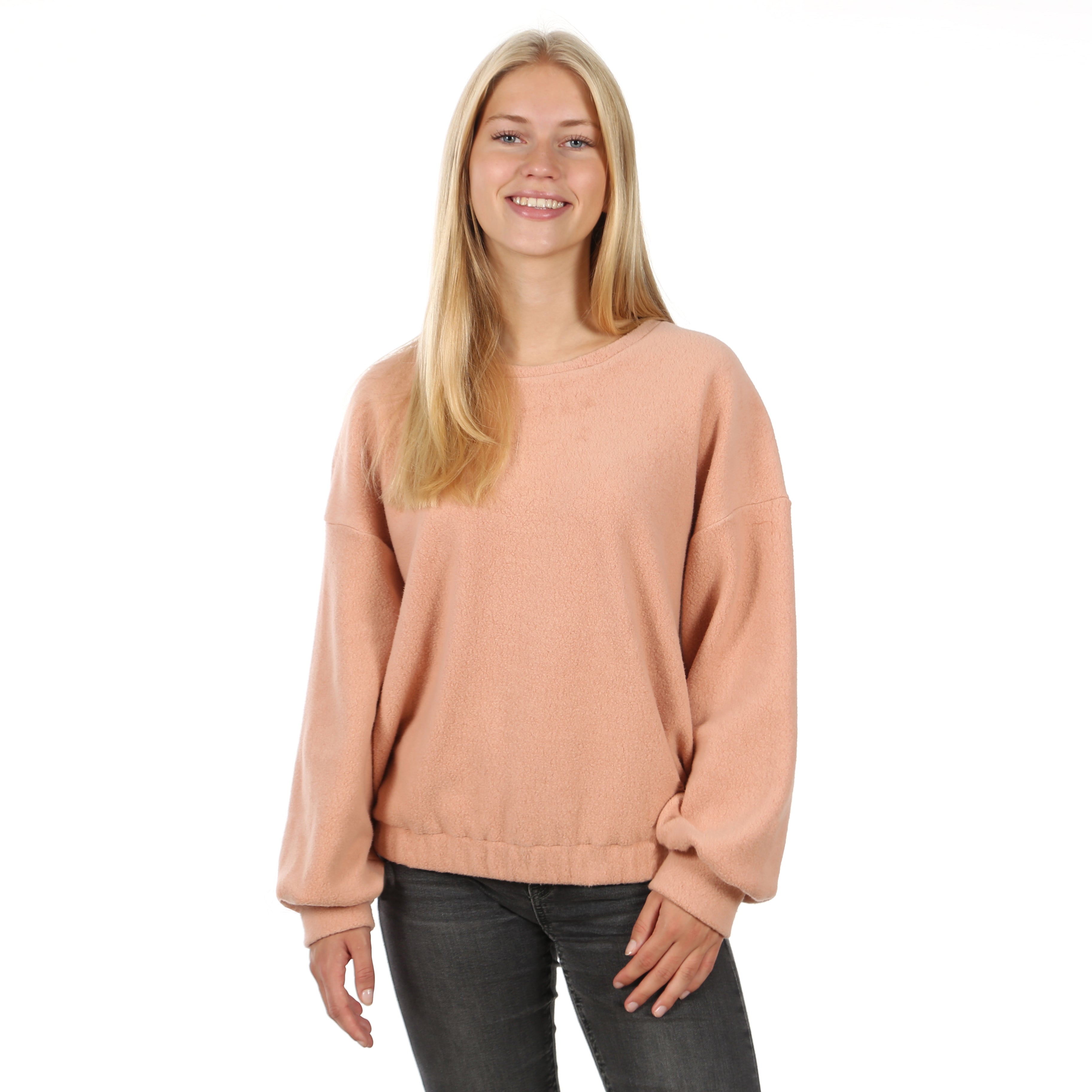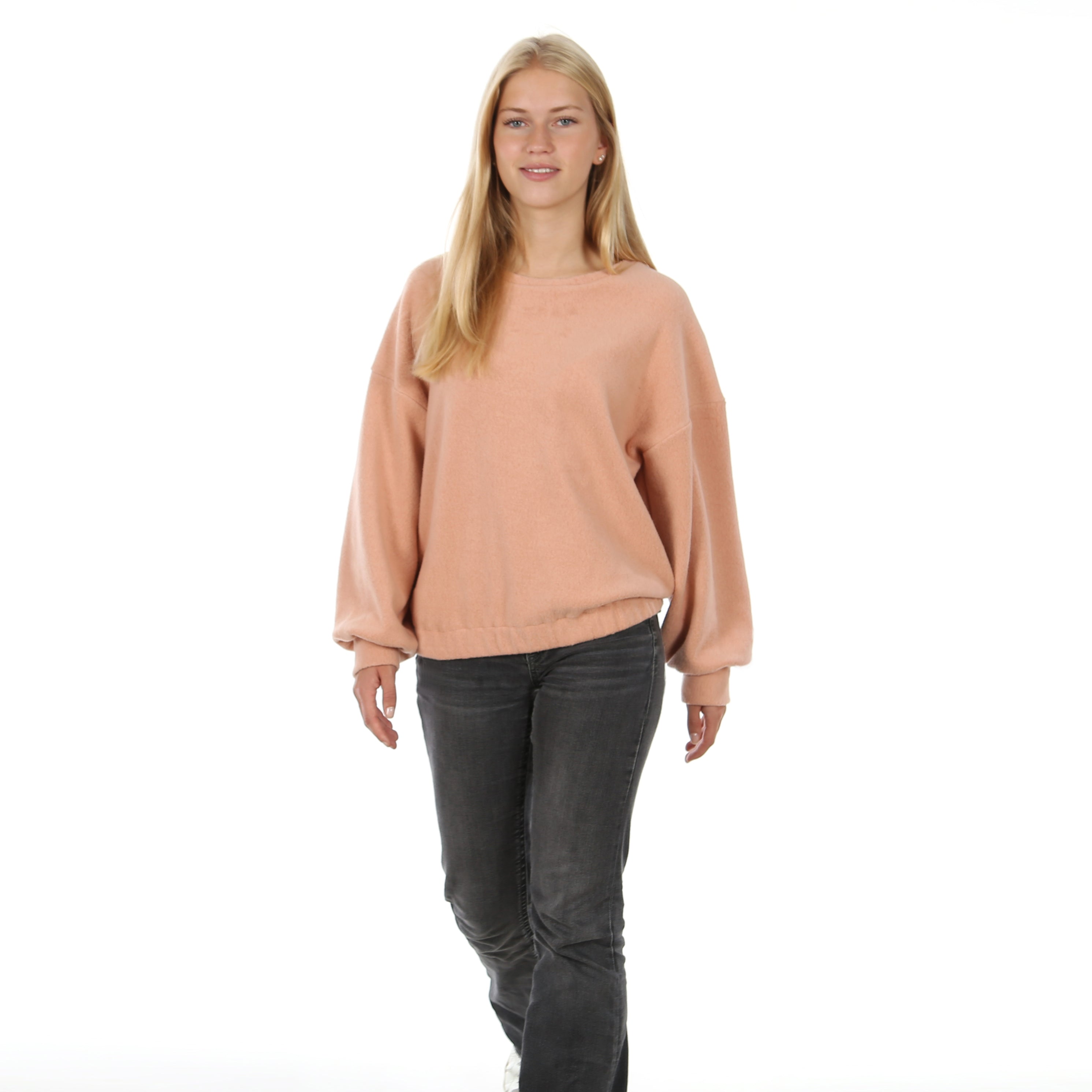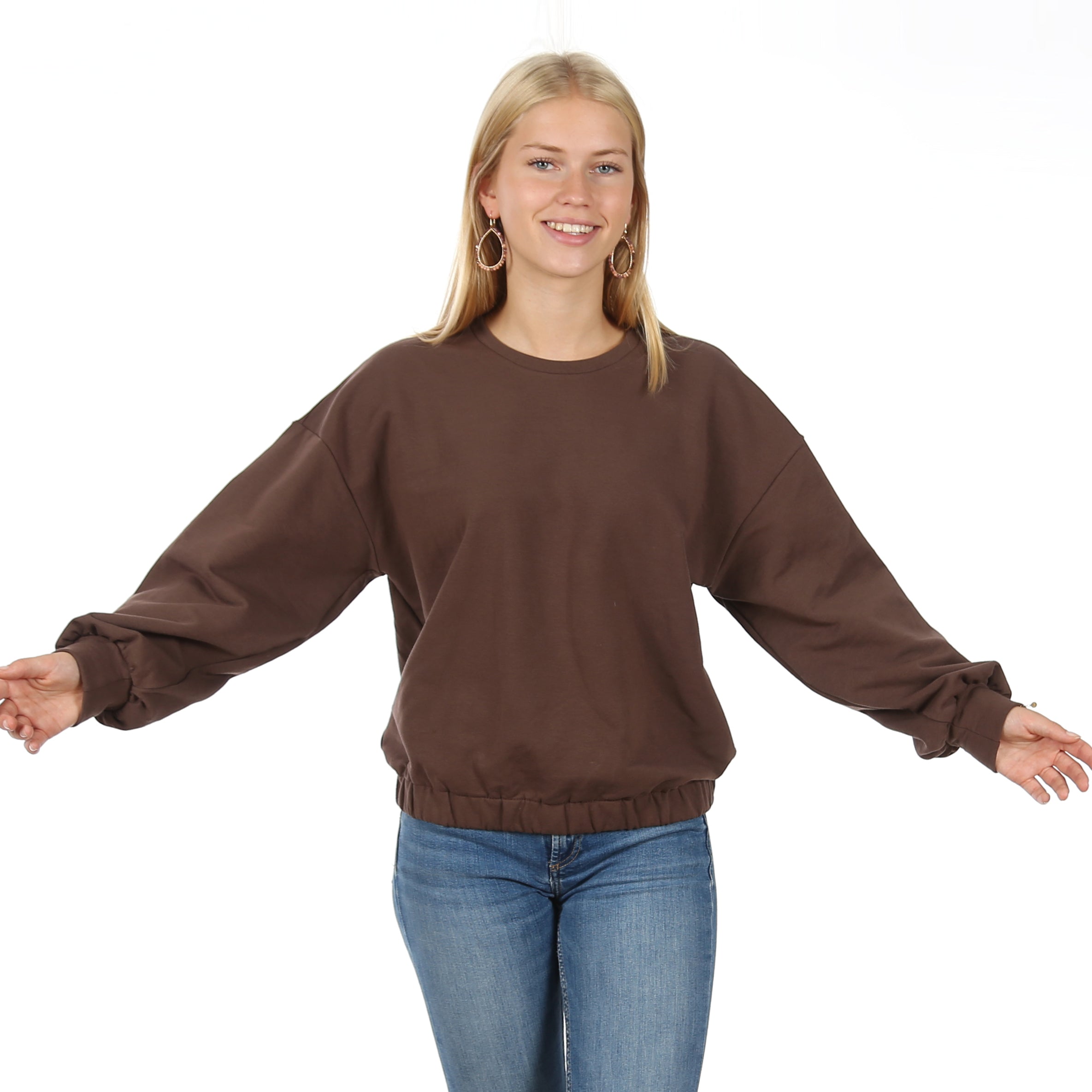 Die weiten, eingekräuselten Ärmel mit Bündchenabschluss und überschnittene Schultern verleihen dem Schnitt eine Extaportion Lässigkeit. Der Saum ist mit einem Gummi leicht gerafft – für einen angenehmen Sitz und maximale Bewegungsfreiheit. Ein klassischer Rundhalsausschnitt rundet das Design ab.