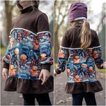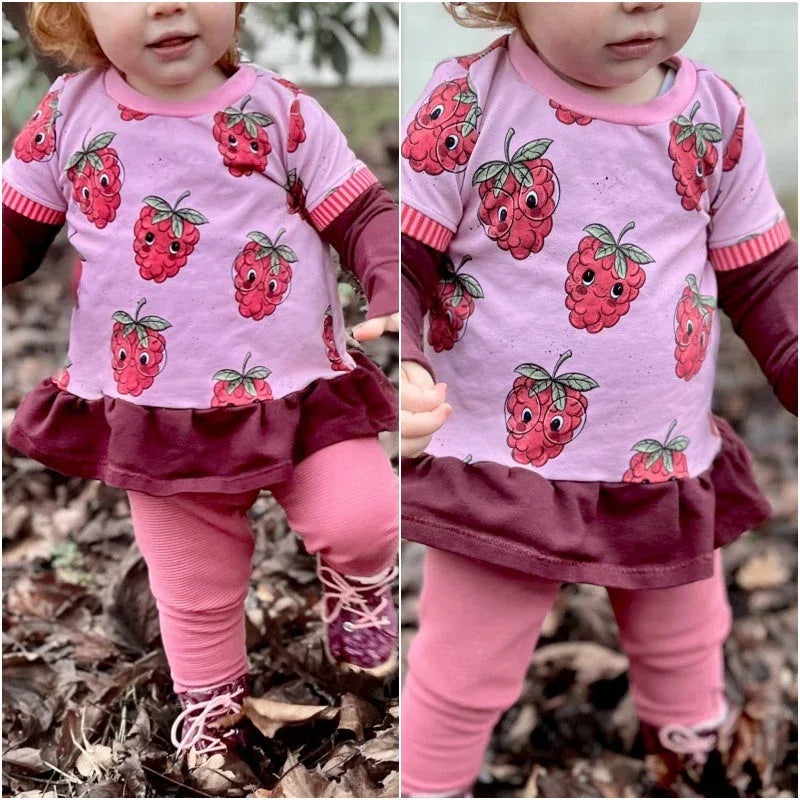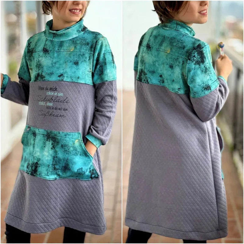 Himbeerschnee ist ein echtes Kuschelteilchen und zum Wohlfühlen an kühleren Tagen perfekt geeignet. Das Schnittmuster ist auf dickere, dehnbare Stoffe ausgelegt und bringt gleich vier verschiedene Längen als Umsetzungsoptionen mit. Es gibt eine kurze Länge, eine mittellange Länge und ein langes Kleid. Zusätzlich gibt es eine Abschlussrüsche, die beim Anbringen an die kürzeste Länge eine weitere Länge ergibt. Neben diesen Optionen gibt es bei den Ärmeln weitere Auswahlmöglichkeiten. So sind im Schnittmuster Himbeerschnee normale, lange Ärmel enthalten oder Ärmel mit einem gerafften Abschluss. Beide Ärmelversionen werden mit Bündchen abgeschlossen. Zusätzlich gibt es die eine Teilung, die sowohl beim Vorder- und Rückteil als auch bei den Ärmeln verwendet werden kann. Ein kleines Highlight stellt die Tasche dar, die aufgenäht wird und mit Belegen verarbeitet wird. Hier ergeben sich tolle Gestaltungsmöglichkeiten. Am Halsausschnitt kann Himbeerschnee mit Halsbündchen oder einem süßen und wärmenden Stehkragen genäht werden.
