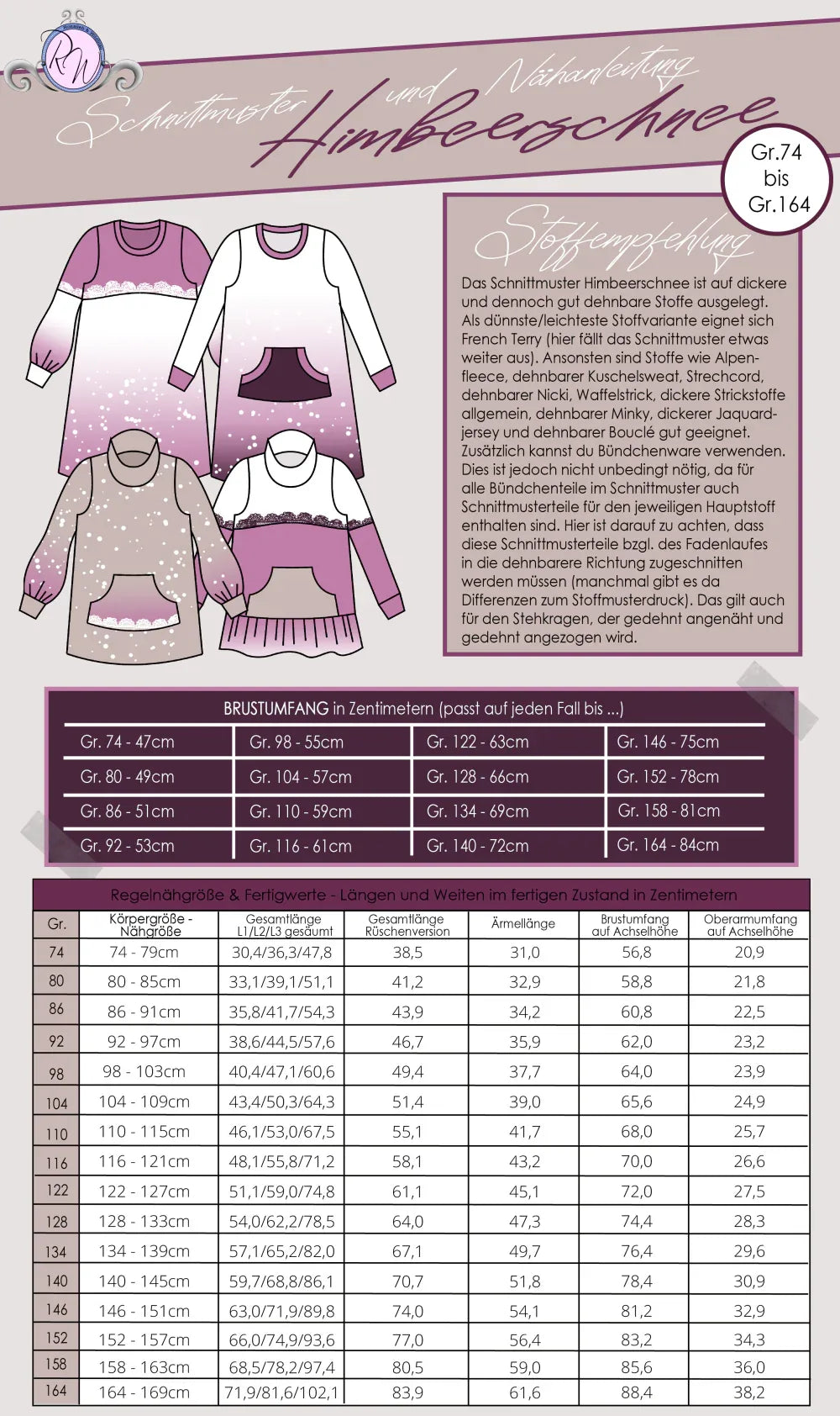 Schnittmuster Himbeerschnee Kuschelkleid Gr. 74 bis 164