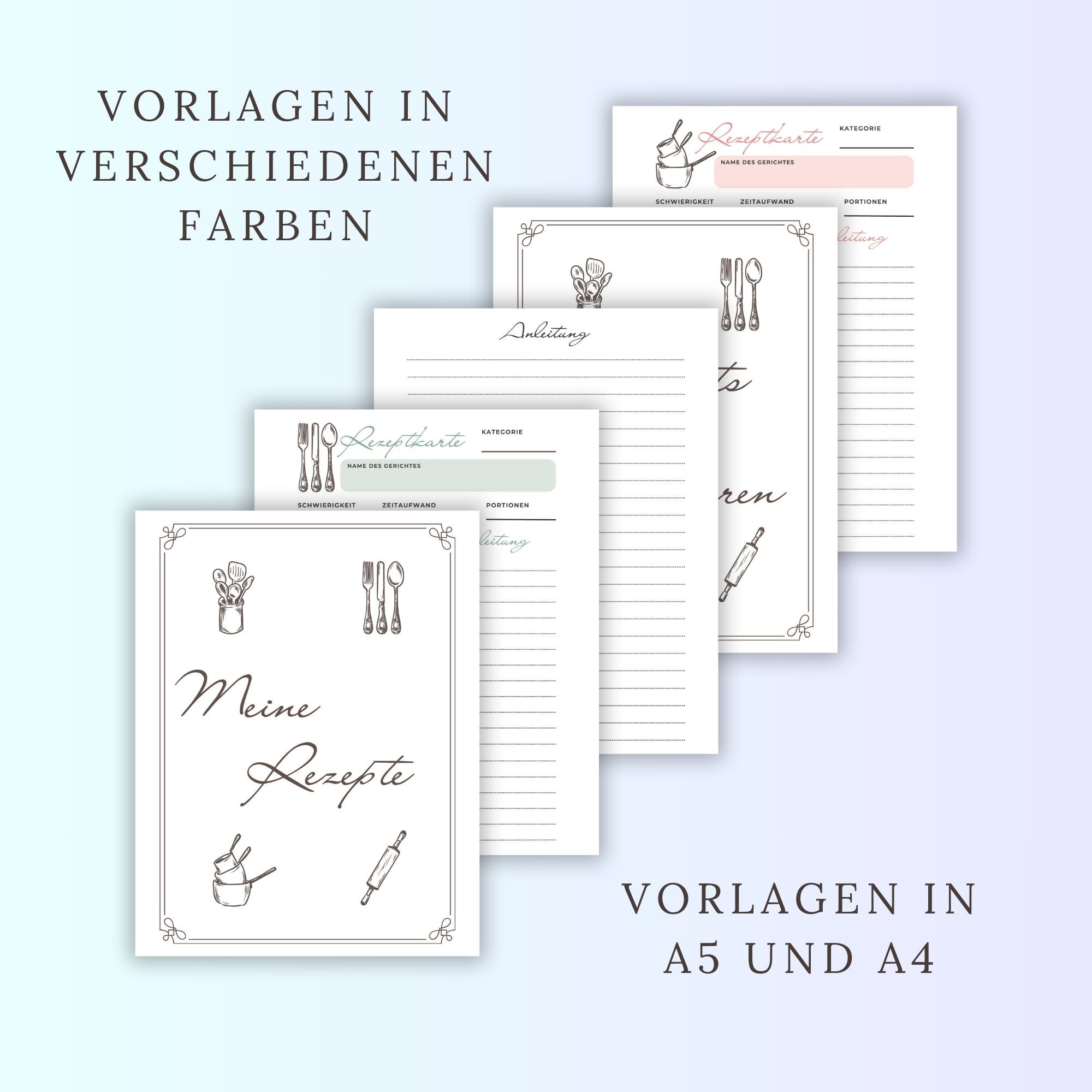 Enthalten sind verschiedene Deckblätter, Rezeptkarten, eine Einkaufsliste und ein Menüplan für besondere Anlässe. Du kannst die einzelnen Seiten mixen, wie es zu dir und deinen Bedürfnissen passt.