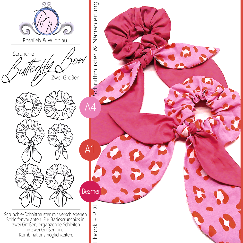 Das Schnittmuster ButterflyBow enthält die Schnittmusterteile für einen Basicscrunchie in zwei unterschiedlichen Größen. Du kannst beide Größen für normale Pferdeschwanzfrisuren nutzen. Die kleinere Version eignet sich auch toll für Zöpfe. Zusätzlich zu diesen beiden Basicvarianten wird der Scrunchie durch viele verschiedene Schleifenversionen ergänzt. Auch hier gibt es jeweils zwei Größen, sodass du sie passend zu den Scrunchiegrößen oder aber auch frei nach deinem Geschmack kombinieren kannst. Neben diesen Möglichkeiten kannst du die ergänzenden Schleifen auch super schön kombinieren - sodass Haarschmuck entsteht, der einem Schmetterling gleicht. Dabei handelt es sich dann natürlich um auffälligere Werke, jedoch sehen sie einfach super hübsch aus. Bei den Schmetterlingsversionen lassen sich auch toll Stofffarben und Stoffmuster kombinieren, sodass es nie langweilig wird. Für alle Fans der Gestaltung gibt es viele weitere Möglichkeiten, wie etwa Perlen an den spitzen Enden usw..