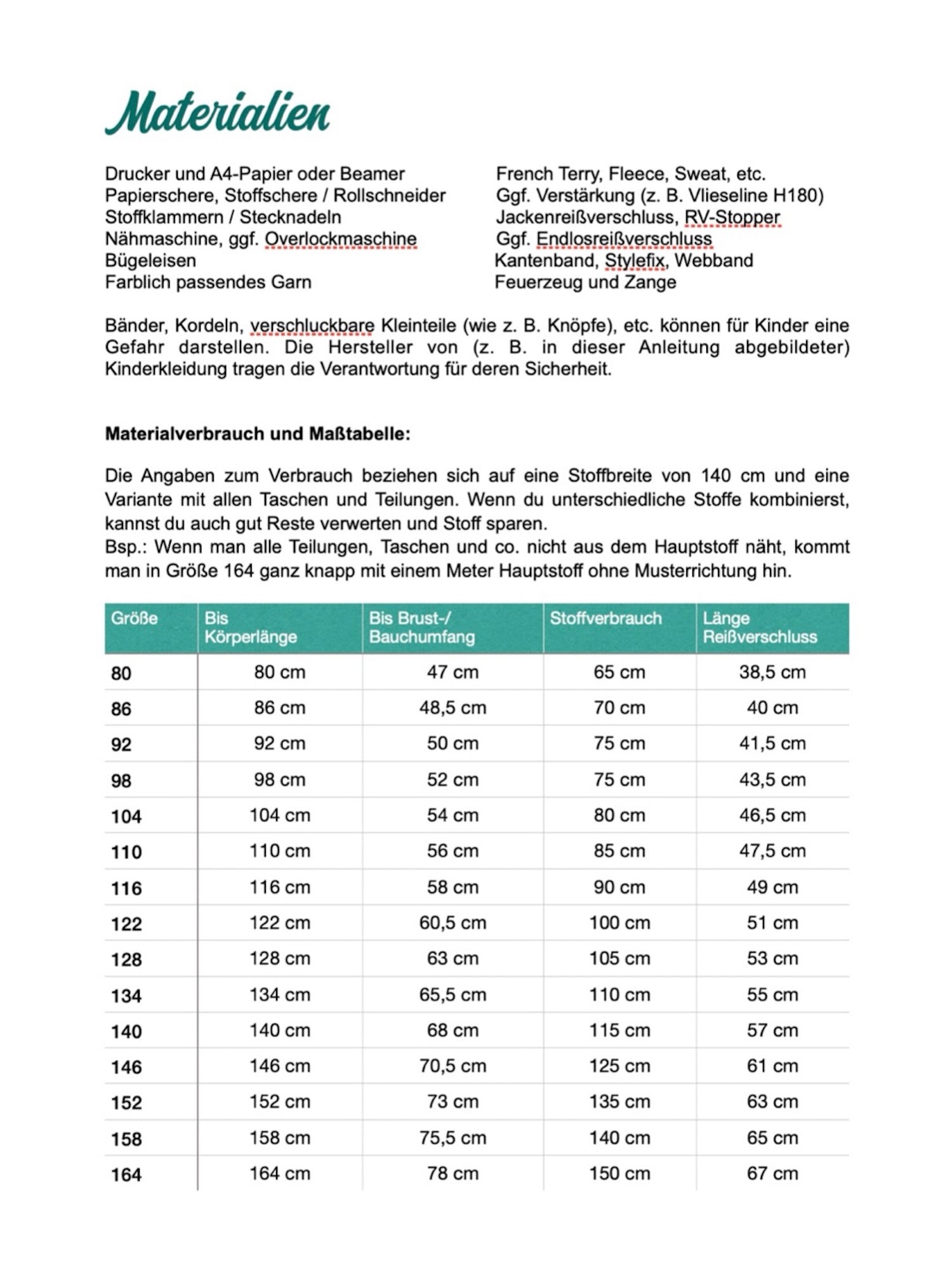 - Geeignete Stoffe: Fleece, Sweat, French Terry