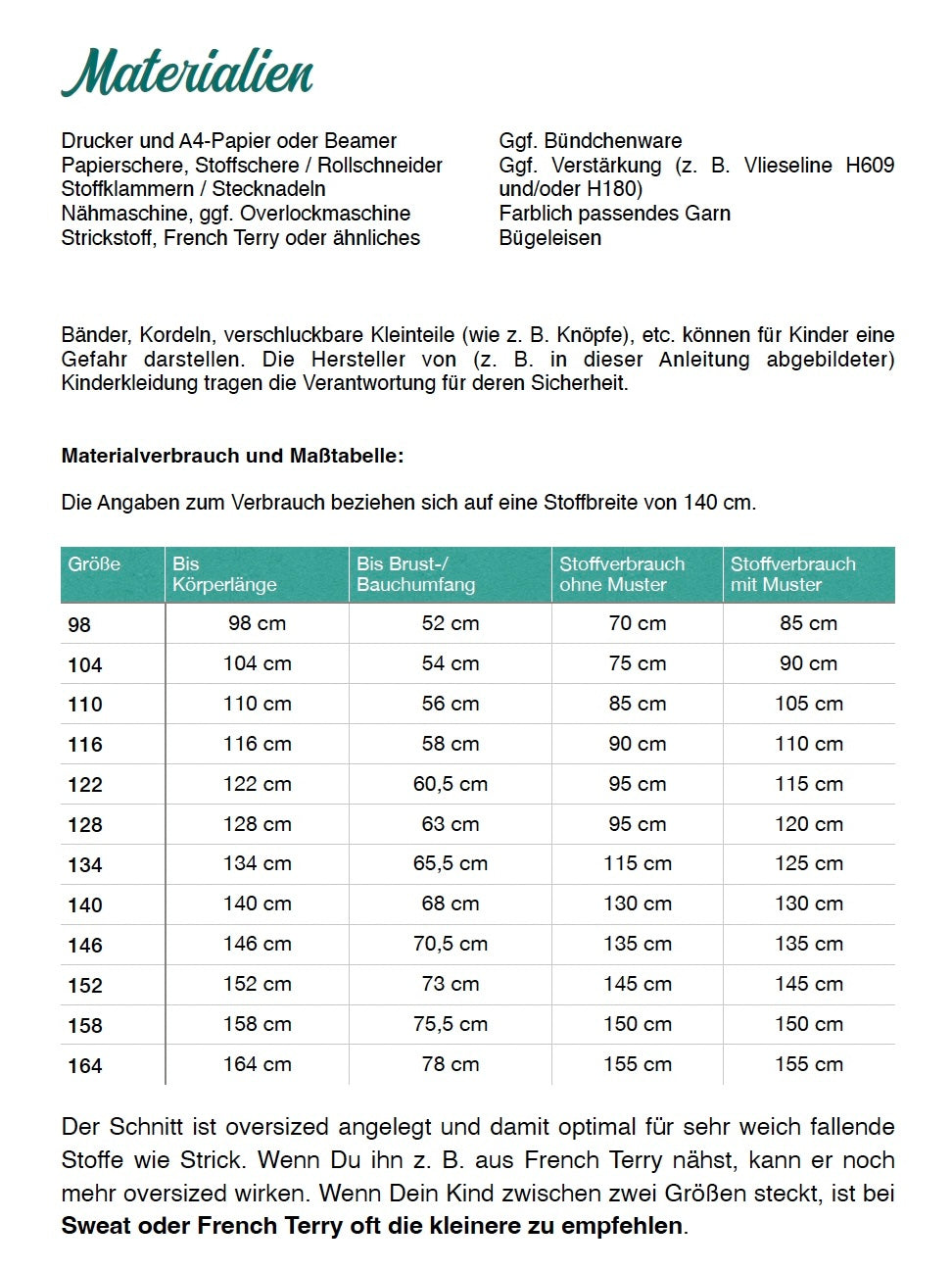 - Geeignete Stoffe: Strick, Jersey, Sweat, French Terry