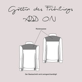 In diesem ADD ON zum Basis Schnittmuster von GÖTTIN DES FRÜHLINGS findest du eine Rückenpasse für die Ergänzung einer Teilungsnaht im Rückenteil, die auf die Teilungsnaht der Ärmel abgestimmt ist und eine Stoffverbrauchsberechnung für eine zweifarbige Jacke, sowie eine Anleitung zur Vorbereitung und Verarbeitung dieser Rückenpasse.