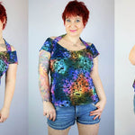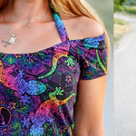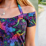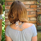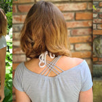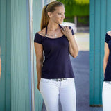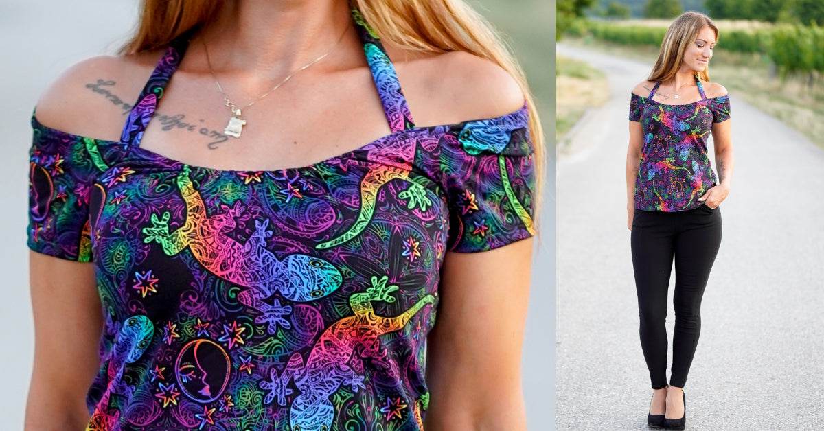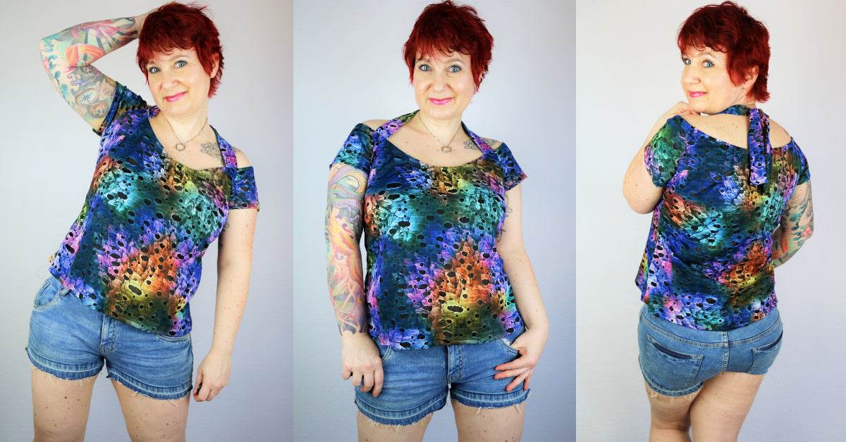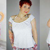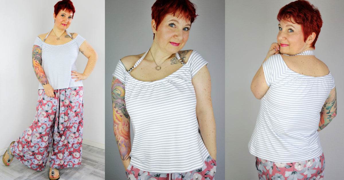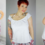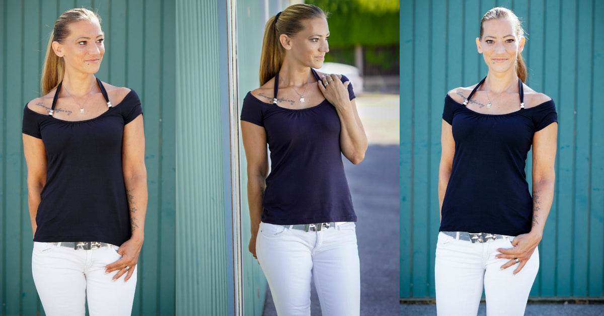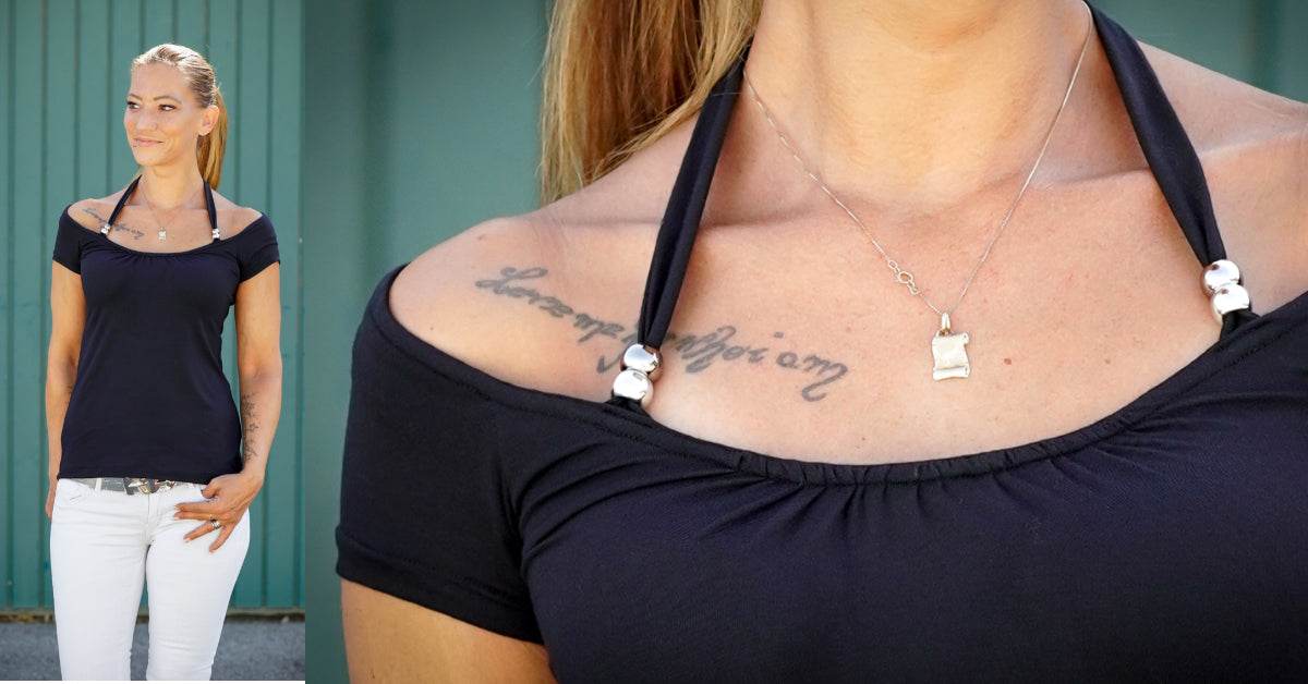 Anciolina lässt die Schultern lässig frei. Sie ist ein Off-Shoulder Shirt mit kurzen Armen, einem tiefen, weich verlaufen Ausschnitt, der Dekolleté zeigt. Auch der Rücken hat einen schönen, tiefer verlaufenen Ausschnitt. Der besondere – wenn auch schlichte – Hingucker ist der Neckholder Träger. Durch seine Breite und dem weichen Stoff ist er sehr angenehm zu tragen. Er verleiht dem Shirt seinen sommerlichen Charakter. Und ganz nebenbei sorgt er dafür, dass nichts verrutscht!