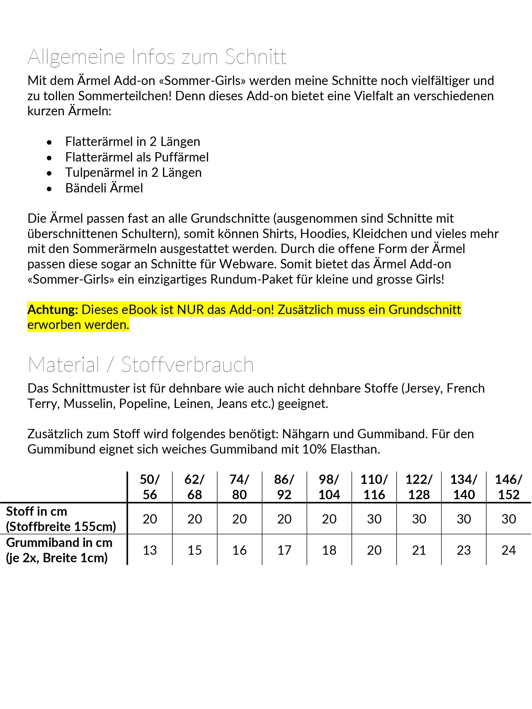 Ärmel Add-on "Sommer-Girls", Schnittmuster Grösse 50-152 in Doppelgrössen
